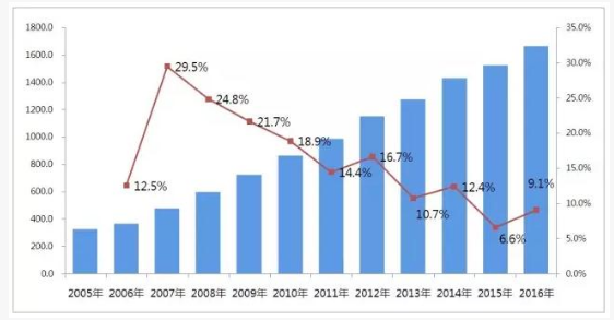 从样本医院市场表现来看,药品销售已经从前几年的20%左右的增速放缓至10%左右。国内样本医院数据显示,PDB样本医院整体市场由2005年的326.9亿元,上升至2016年的1661.5亿元,2005-2016年复合增长率为16.9%。