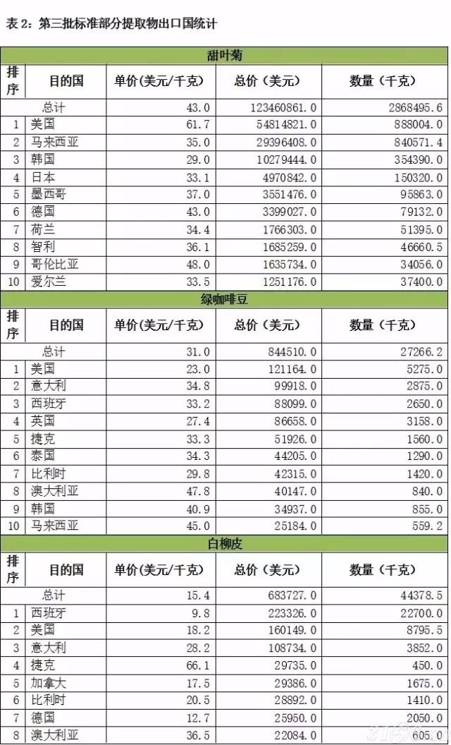 此外记者留意到,2016年,我国提取物出口排名前十的品种包括:甜菊提取物、桉叶油、薄荷醇、甘草提取物、万寿菊提取物、辣椒色素、越橘提取物、芸香苷及其衍生物、橙皮苷、桂油等。但桉叶油、薄荷醇、甘草,提取物等这些排名靠前的品种还不在目前25个已有标准的名单中。