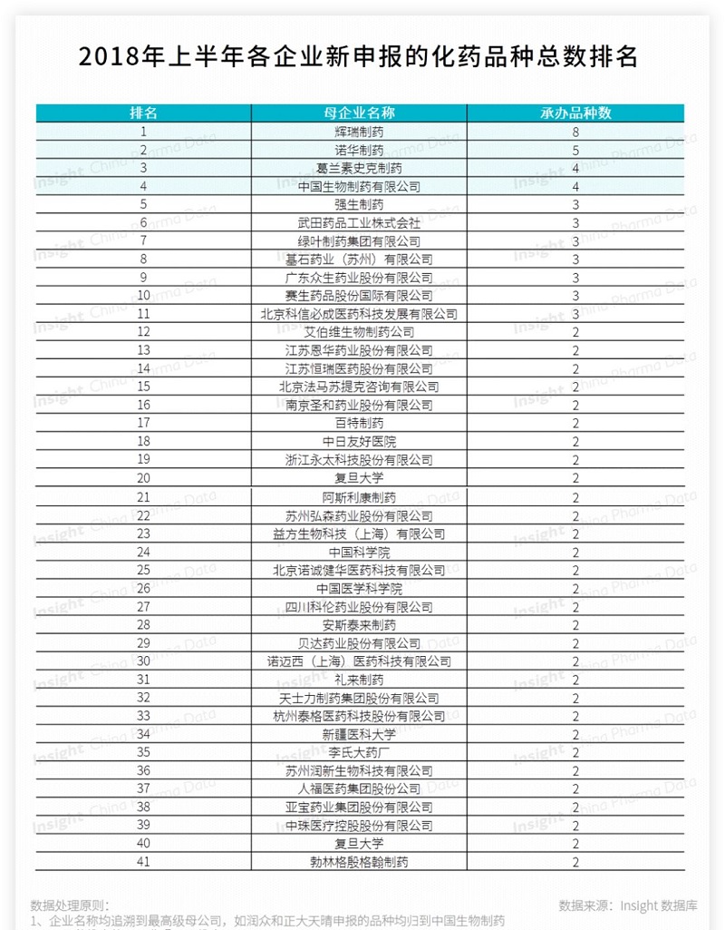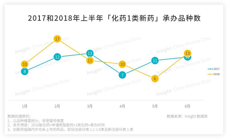 备注:本文统计数据来源丁香园 Insight 数据库,统计纬度均为品种,企业均按照母企业计,数据统计截止日期为 2018 年 6 月 30 日,时间以 CDE 承办时间为准。
