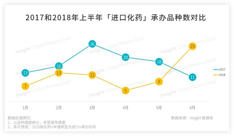 今年上半年进口药申报品种数量为 71 个,在 5 月,2018 年上半年进口化药承办数量前均低于 2017 年同期,2018 年 6 月药品申报出现了一个小高峰,该月进口化药申报品种数量为 25 个,这可能与今年陆续出台的调整进口药品注册管理有关事项的决定有关,在政策上是鼓励进口药申报的。
