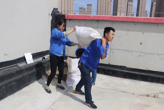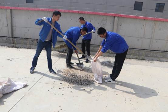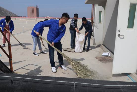 厂区楼顶的泥土、石子、塑料等下雨天被雨水冲刷后,容易堵塞楼顶排水口,存在安全隐患。所以此次清理活动,主要针对楼顶环境卫生、卫生死角进行了集中清理。活动开始后团总支将已准备好的铁锹、簸箕、扫帚等工具分发到各小组,所有人登上楼顶,发挥不怕苦、脏、累的精神,积极地清理石子、泥土、杂物等垃圾。利用废弃的编织袋来装运,即节省了物资,又能二次利用。