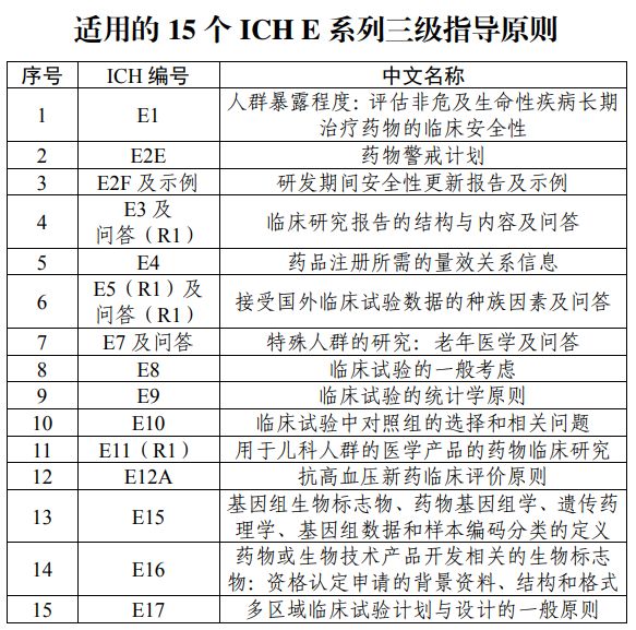 国家药监局关于适用《E1:人群暴露程度:评估非危及生命性疾病长期治疗药物的临床安全性》等15个ICH指导原则的公告