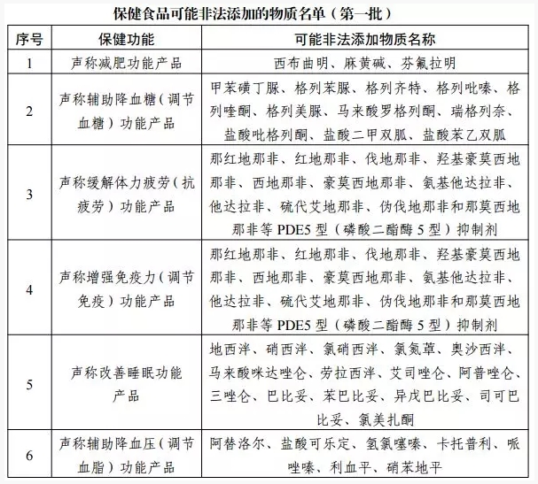 根据国家食品药品监督管理局《保健食品中可能非法添加的物质名单(第一批)》(食药监办保化〔2012〕33号),保健食品可能非法添加的物质名单如下: