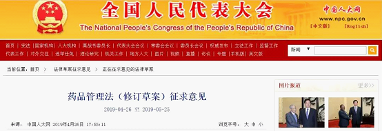 4月26日下午,中国人大网发布“药品管理法(修订草案)征求意见”,征求意见日期为4月26日-5月25日。