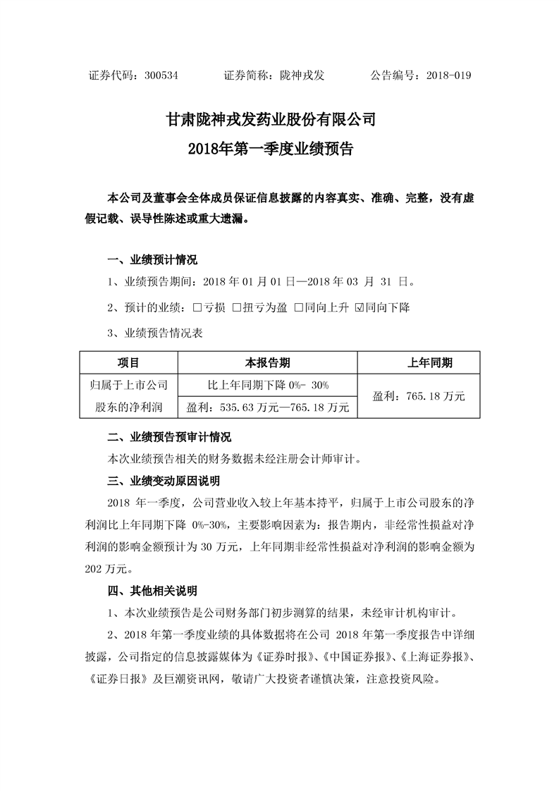 2018年第一季度业绩预告
