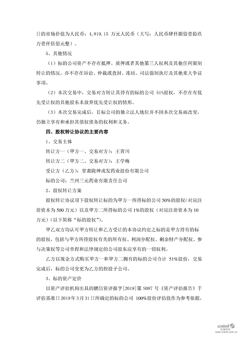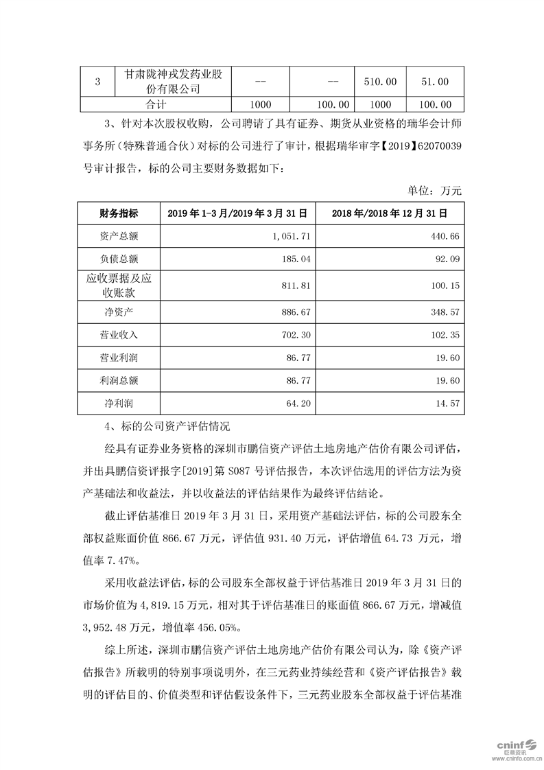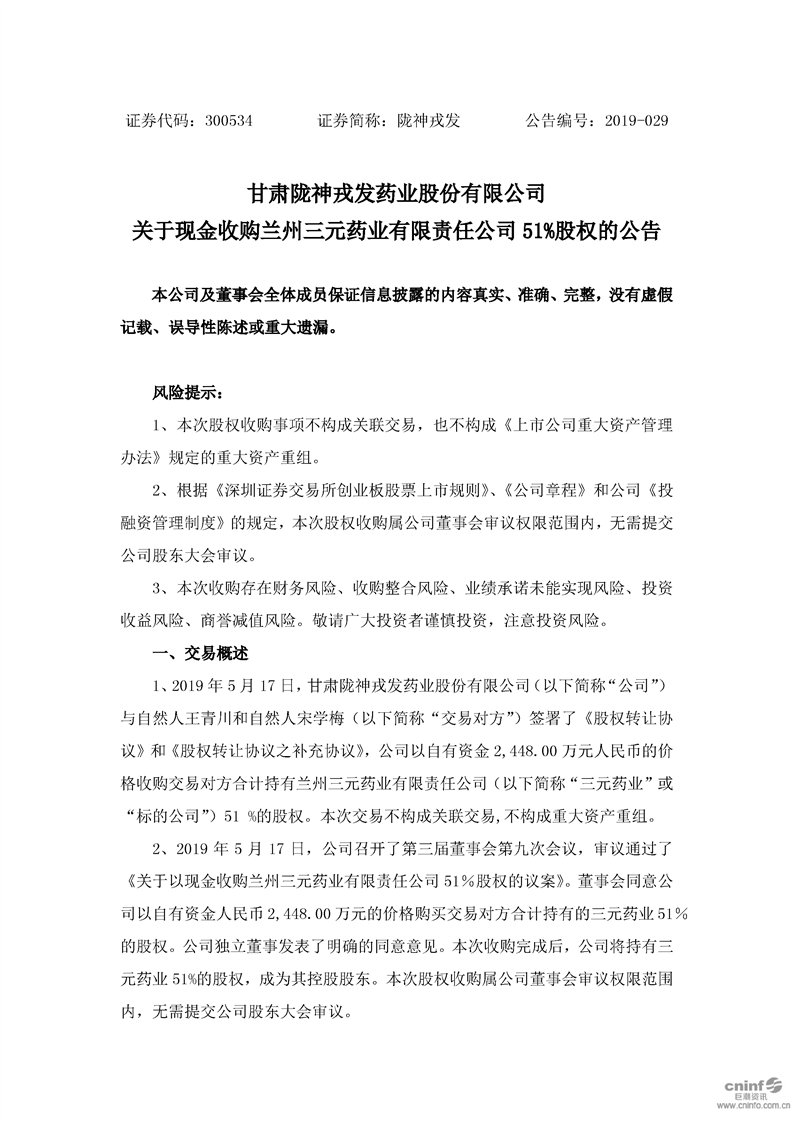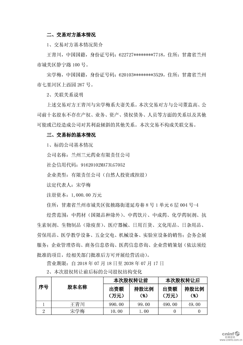 关于现金收购兰州三元药业有限责任公司51%股权的公告