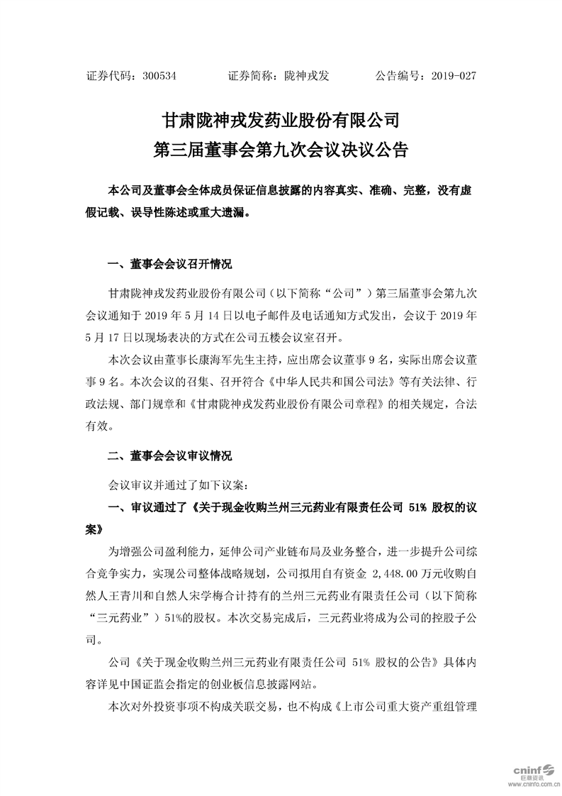 第三届董事会第九次会议决议公告