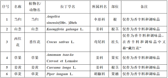根据《食品安全法》规定,经安全性评估并广泛征求意见,现将当归、山柰、西红花、草果、姜黄、荜茇等6种物质纳入按照传统既是食品又是中药材的物质目录管理,仅作为香辛料和调味品使用。按照传统既是食品又是中药材的物质作为食品生产经营时,其标签、说明书、广告、宣传信息等不得含有虚假宣传内容,不得涉及疾病预防、治疗功能。