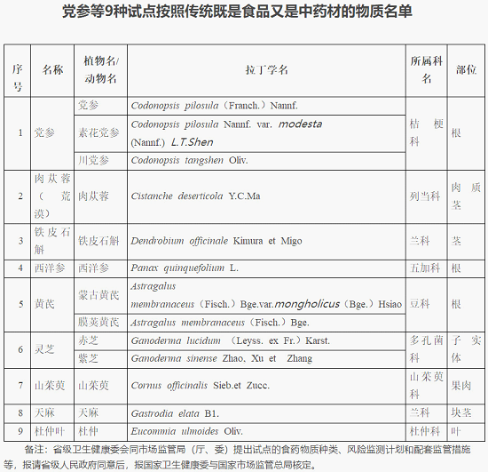 关于对党参等9种物质开展按照传统既是食品又是中药材的物质管理试点工作的通知