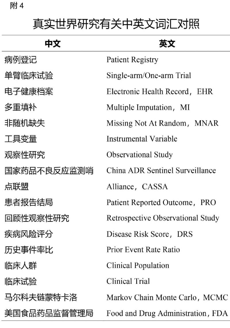 1.病例登记(Patient Registry):根据一个或多个预定的科学、临床或政策目的,使用观察性研究方法收集统一的临床和其它数据的系统,以评价特定疾病、病症或暴露人群的特定结局。
