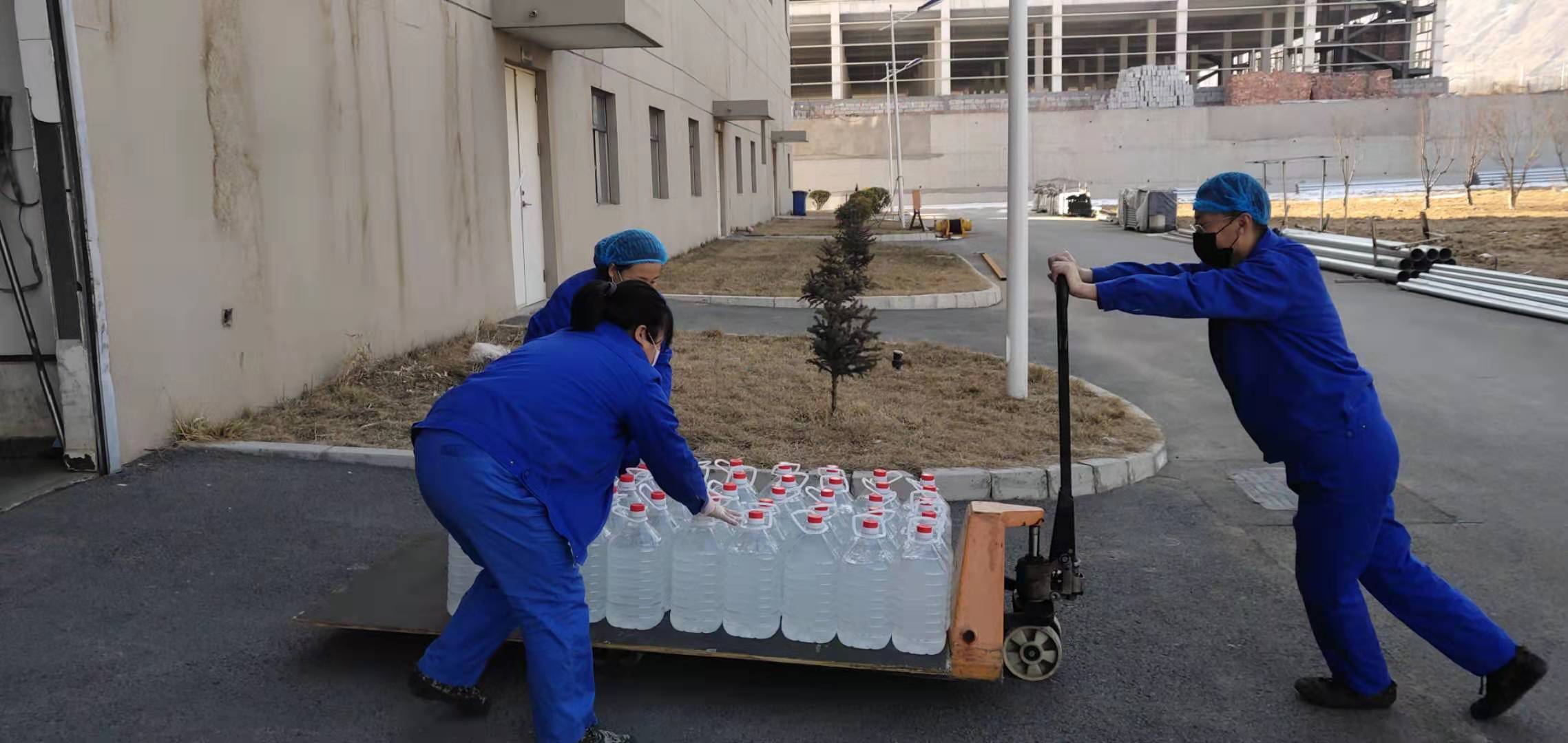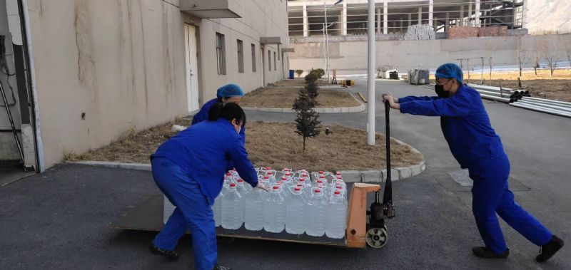 非凡娱乐生产一线员工紧急配制75%酒精,用于疫情防控