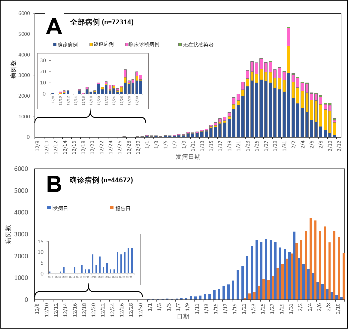 确诊病例报告日期与发病日期流行曲线