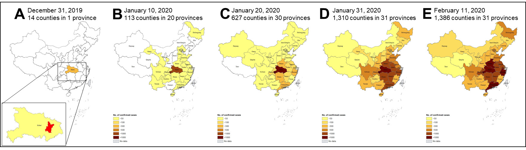 通过对报告病例的发病日期进行回顾性分析,还原了新冠肺炎确诊病例在五个不同时段全国地理分布变化情况。截至2月11日,全国31个省份的1386个县区共报告44672例确诊病例(湖北占74.7%,图2 E),其中,有0.2%的病例发病日期在2019年12月31日之前,病例均在湖北(图2 A);有1.7%的病例发病日期在1月10日之前,分布在20个省份的113个县区,其中湖北占88.5%(图2 B);有13.8%的病例发病日期在1月20日之前,分布在30个省份的627个县区,其中湖北占77.6%(图2 C);有73.1%的病例发病日期在1月31日之前,分布在31个省份的1,310个县区,其中湖北占74.7%(图2 D)。
