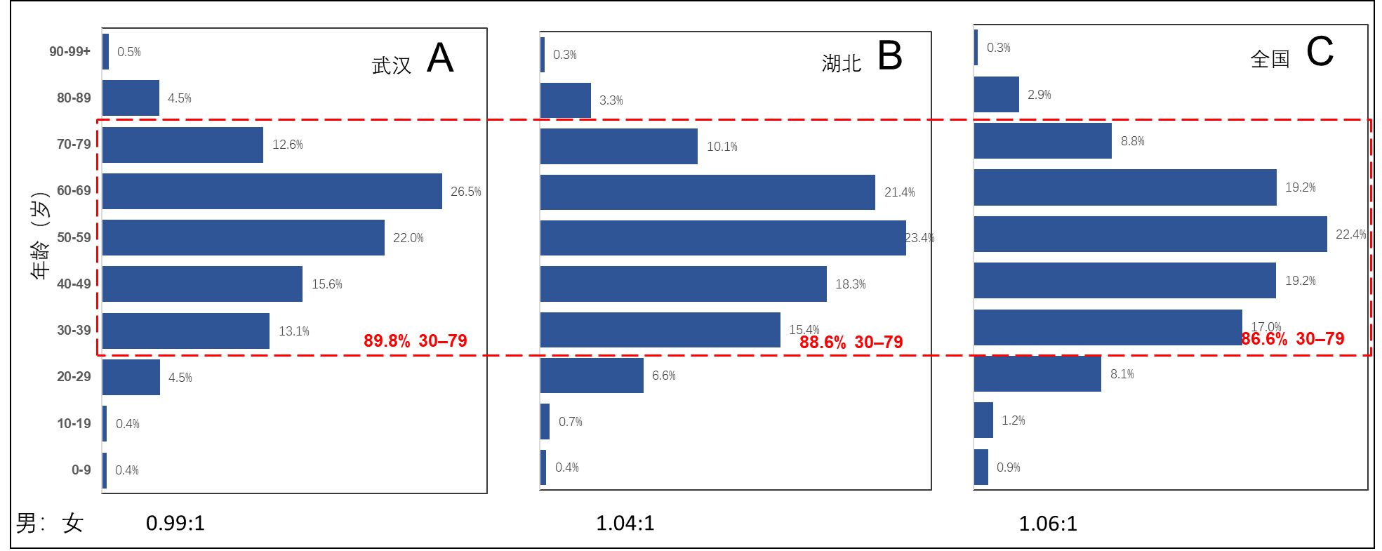 对确诊病例(N = 44672)的特征进行分析发现,病人集中在30-79岁,该年龄组占确诊病例总数比例武汉市为89.8%,湖北省(包括武汉)为88.6%,全国(包括湖北)为86.6%。60岁以上的老年组病例数占比,武汉为44.1%,湖北(包括武汉)为35.1%,全国(包括湖北)为31.2%(图3)。确诊病例男女比例武汉为0.99:1,湖北为1.04:1,全国为1.06:1,农民或工人占22.0%,湖北省占74.7%,81.0%属于轻/中症(表1)。
