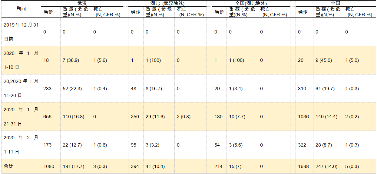 表2. 2019年12月8日-2月11日全国、湖北、武汉报告医务人员