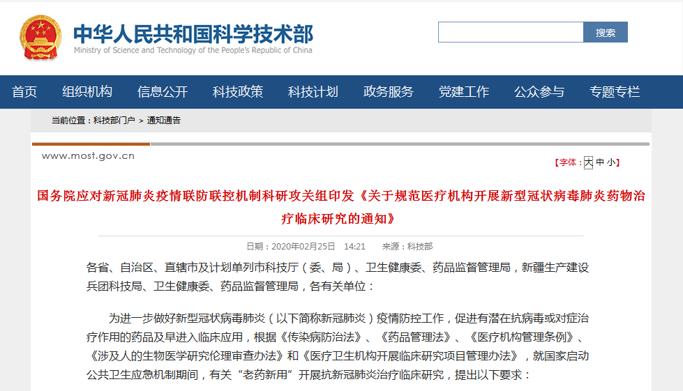 2 月 25 日,国务院应对新冠肺炎疫情联防联控机制科研攻关组印发《关于规范医疗机构开展新型冠状病毒肺炎药物治疗临床研究的通知》,就国家启动公共卫生应急机制期间,有关「老药新用」开展抗新冠肺炎治疗临床研究,提出 4 个方面要求。