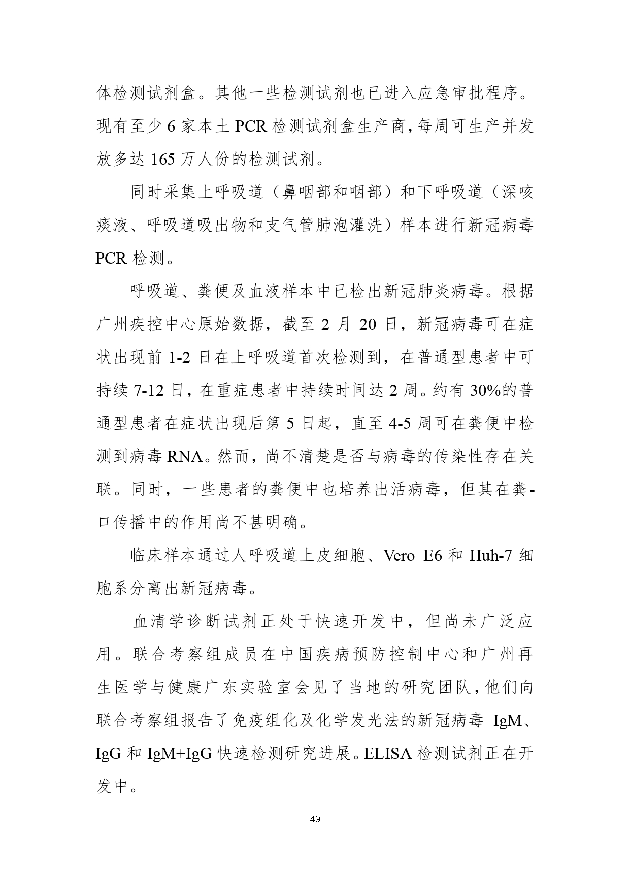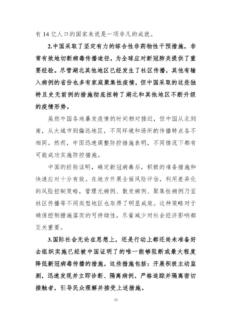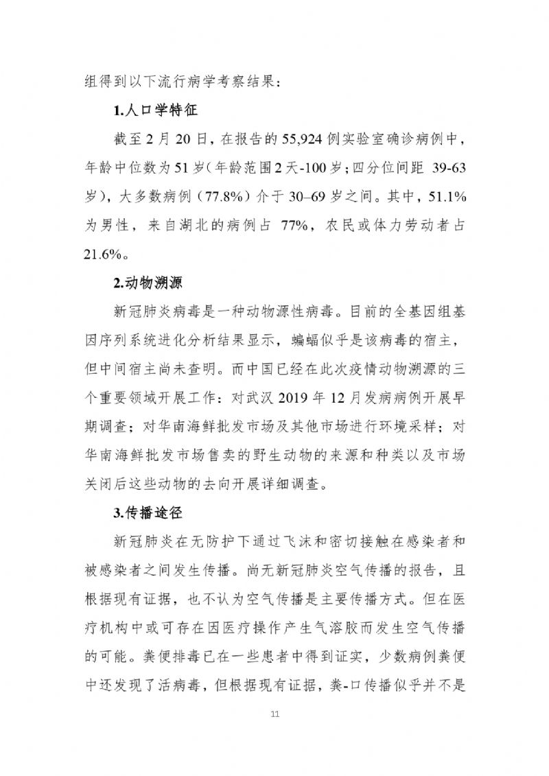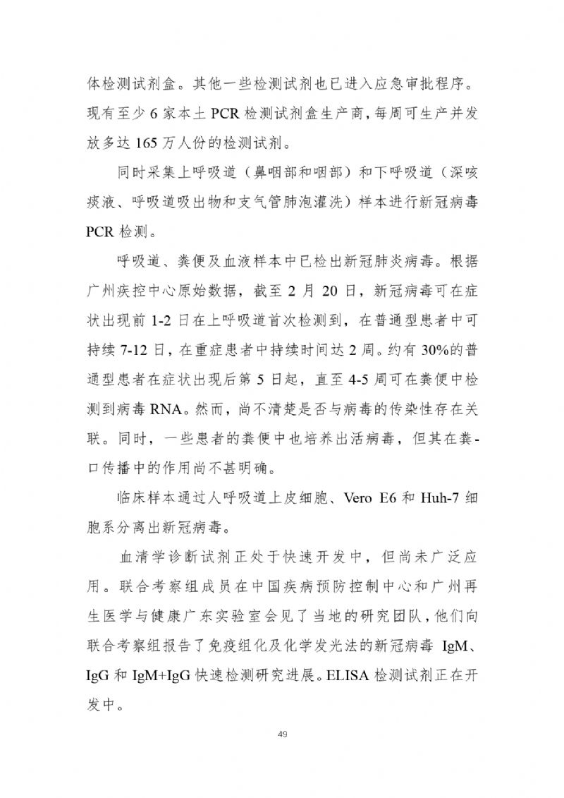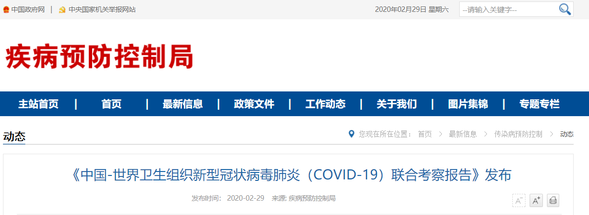 2月29日,国家疾病预防控制局发布《中国-世界卫生组织新型冠状病毒肺炎(COVID-19)联合考察报告》,对重视问题、主要发现、中国和全球应对措施及下一步工作进行了阐述,并且公布了部分实验室检验、诊断与病毒学、研发等方面详细的技术调查结果。