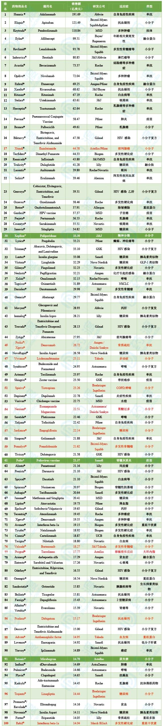 随着世界各大医药公司陆续发布了2019年年报,最新的全球药物销售额TOP100榜单也就出炉了。统计发现,TOP100的门槛已经超过了14亿美元,比去年增长了超过10%,TOP100销售总额达到了3370亿美元,比去年增长了大约7%,反映出全球药物市场的不断快速增长。今年全球的“药王”依然是艾伯维的抗TNFα单抗Humira®(修美乐®),这也是其连续8年蝉联销售冠军。受欧洲等地区专利已经到期的影响,它的销售额比去年下降了 3.85%至191.69亿美元,冲击200亿美元大关再次失败,这应该也是它最后的机会,未来几年它的销售额将会不断下滑,但还不至于断崖式的跌落,因为在它的主要市场美国,艾伯维进行了一系列的专利保护措施,赢得了几乎所有的专利诉讼,使得它未来几年还能受专利保护。