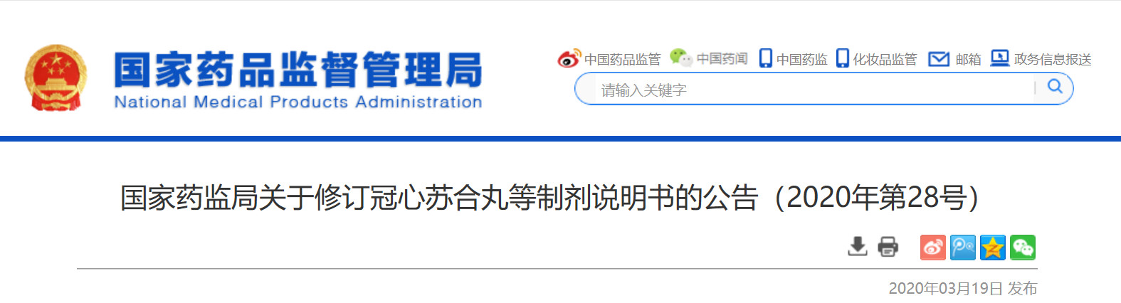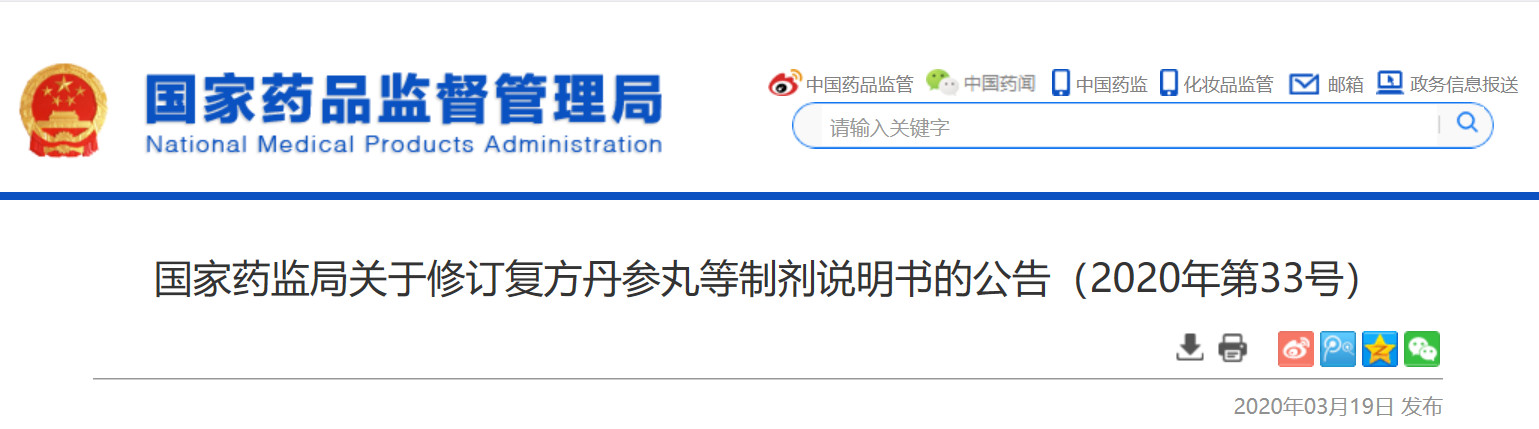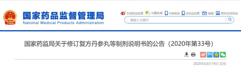 3月19日,国家药品监督管理局对复方丹参丸,包括复方丹参丸、复方丹参片、复方丹参胶囊、复方丹参软胶囊、复方丹参肠溶胶囊、复方丹参喷雾剂(复方丹参气雾剂)、复方丹参颗粒、复方丹参滴丸、复方丹参口服液等制剂,冠心苏合丸等制剂11个品种说明书进行统一修订。