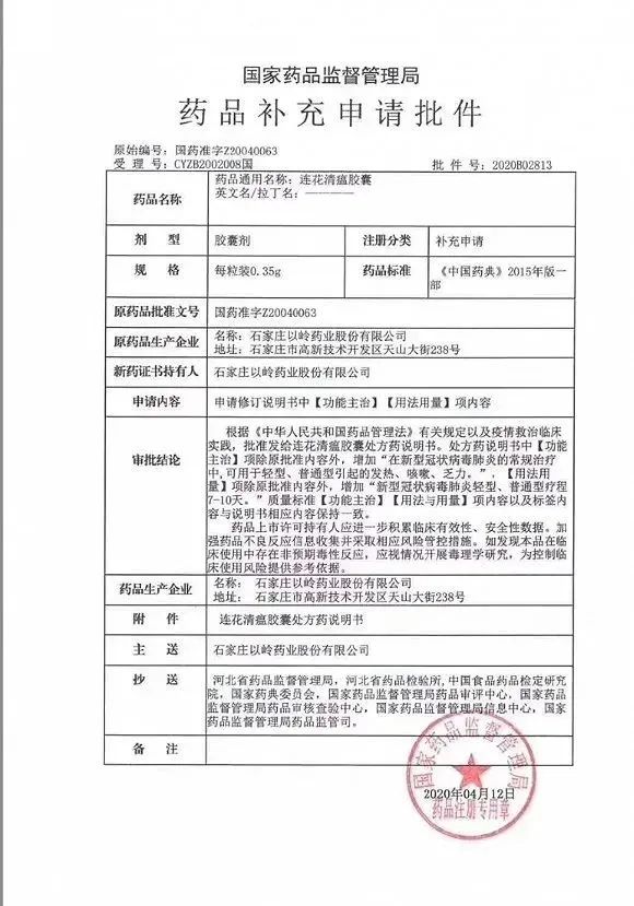 今天(4月14日),以岭药业发布午间公告称:石家庄以岭药业股份有限公司和公司全资子公司北京以岭药业有限公司收到国家药品监督管理局下发的连花清瘟胶囊和连花清瘟颗粒的关于新增适应症申请的《药品补充申请批件》