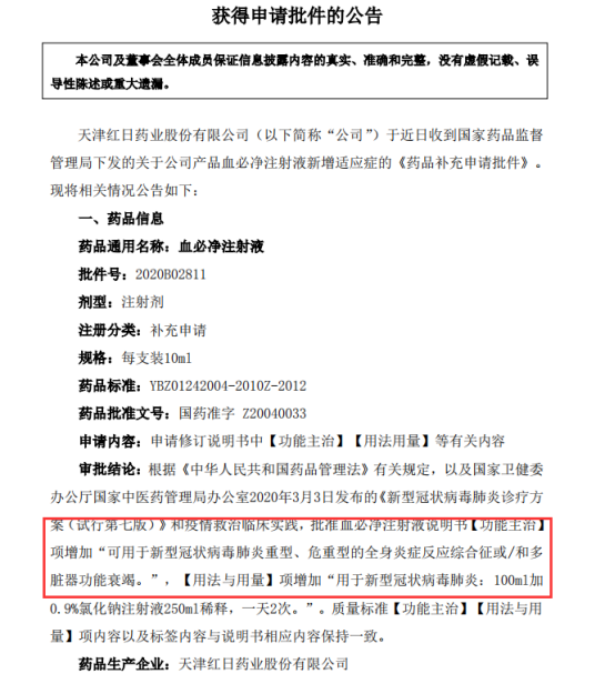 4月14日,红日药业发布公告称,于近日收到国家药品监督管理局下发的关于血必净注射液新增适应症的《药品补充申请批件》,【功能主治】项增加“可用于新型冠状病毒肺炎重型、危重型的全身炎症反应综合征或/和多脏器功能衰竭。”