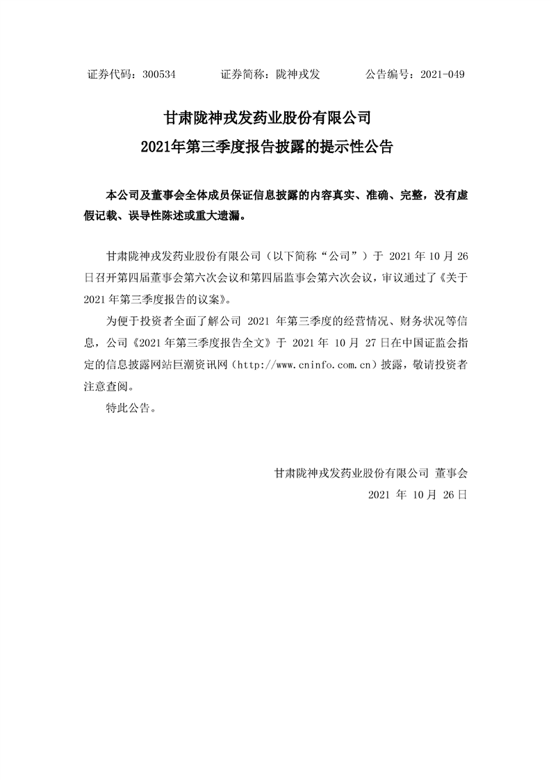 2021年第三季度报告披露的提示性公告