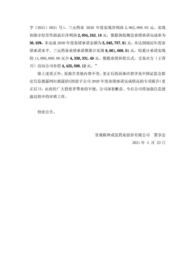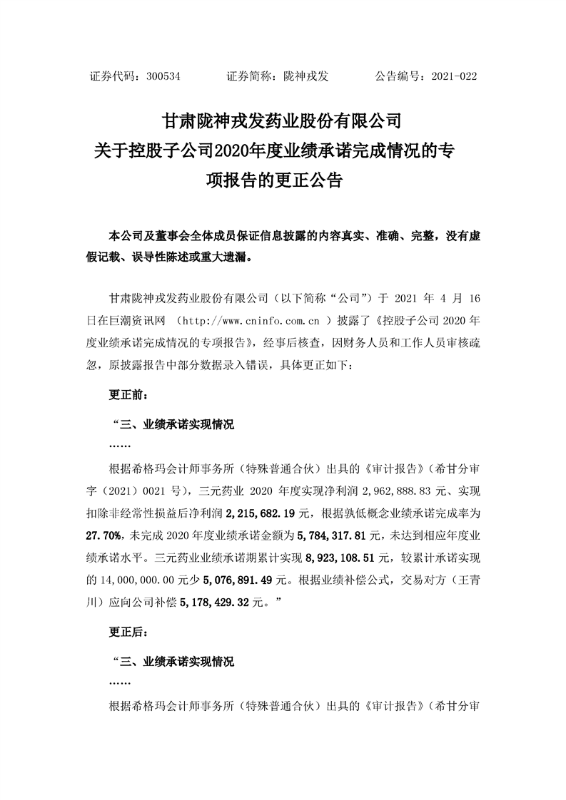 关于控股子公司2020年度业绩承诺完成情况的专项报告的更正公告