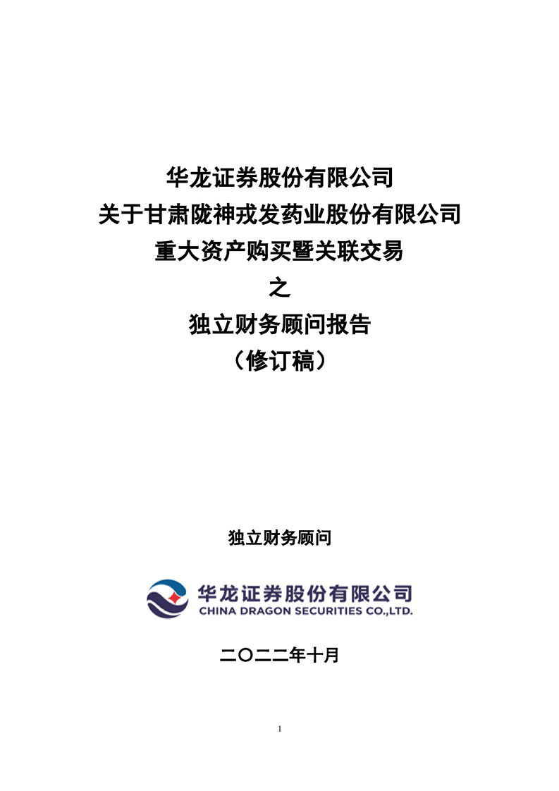 华龙证券股份有限公司关于甘肃非凡娱乐药业股份有限公司重大资产购买暨关联交易之独立财务顾问报告(修订稿)