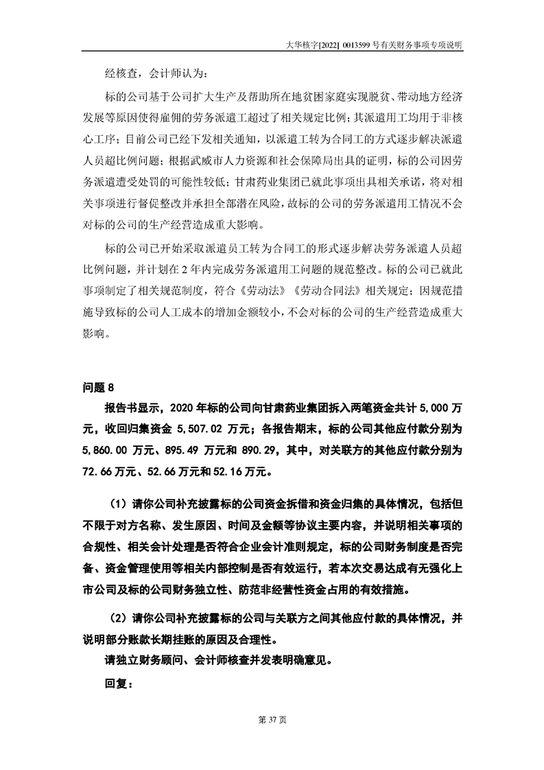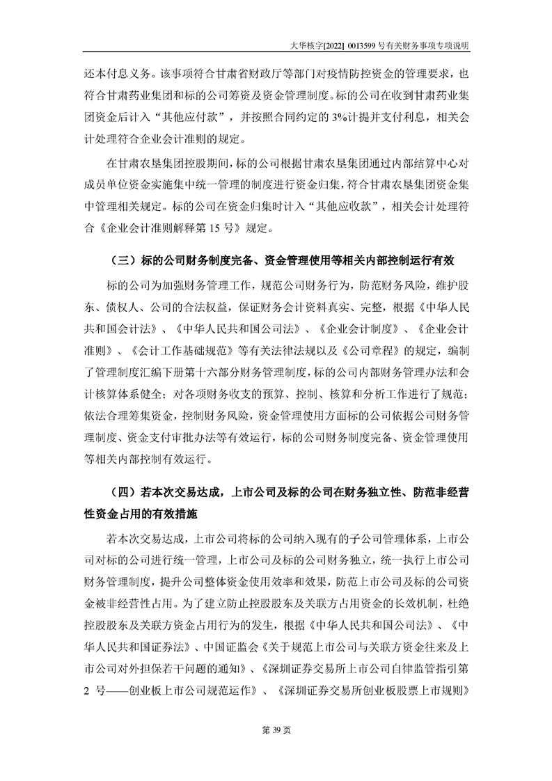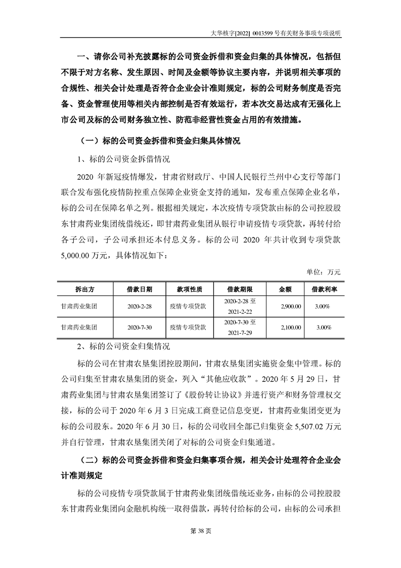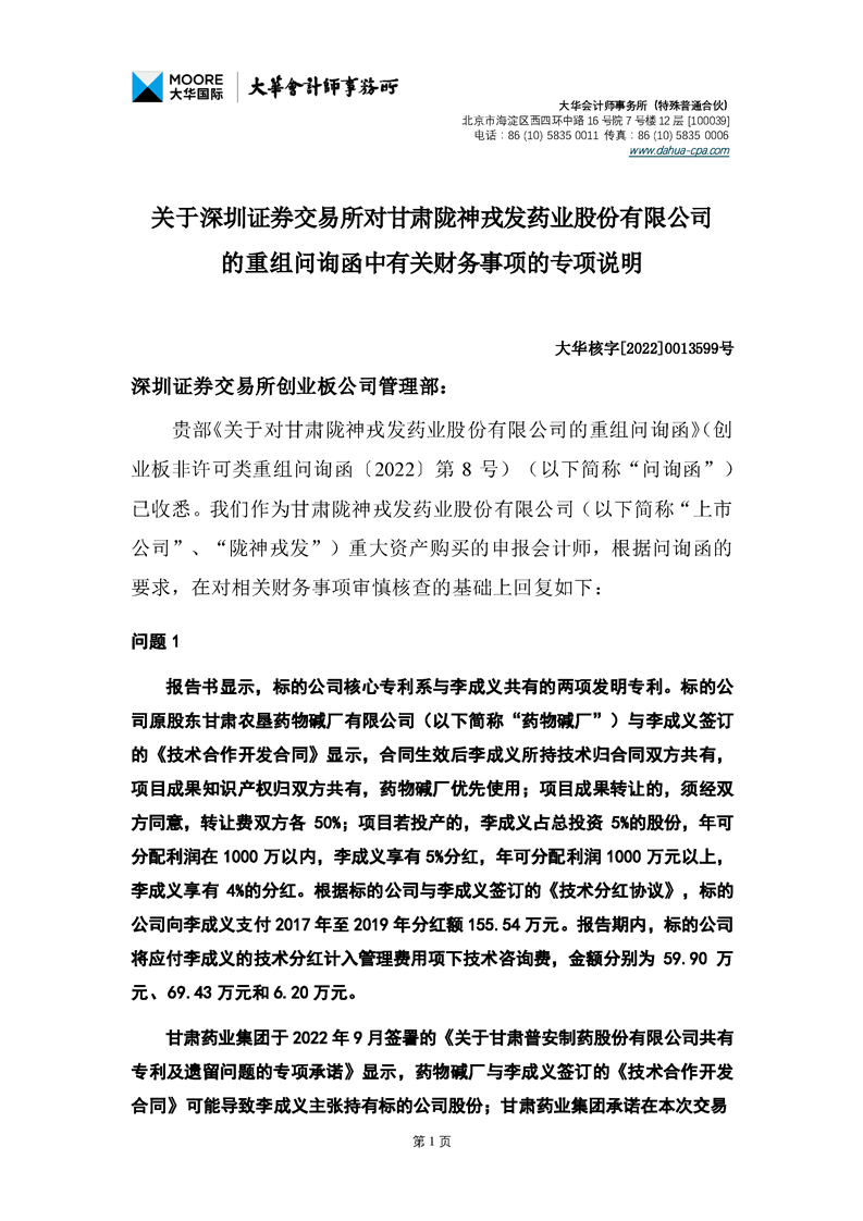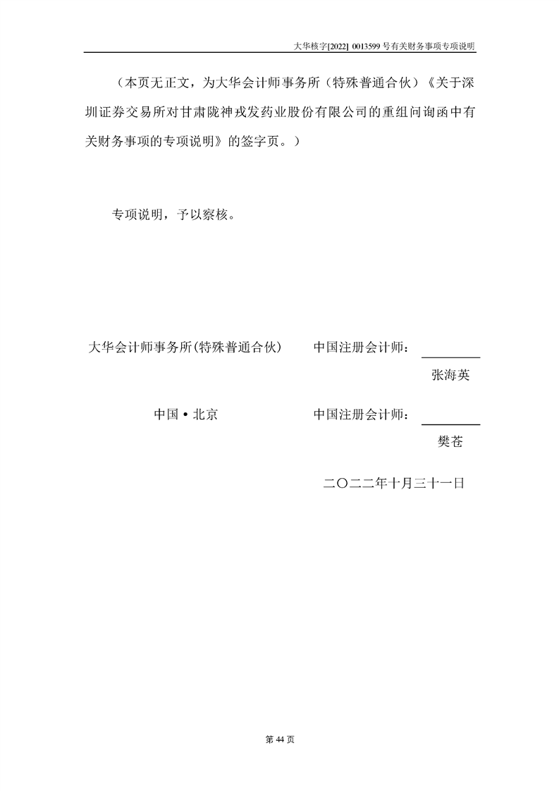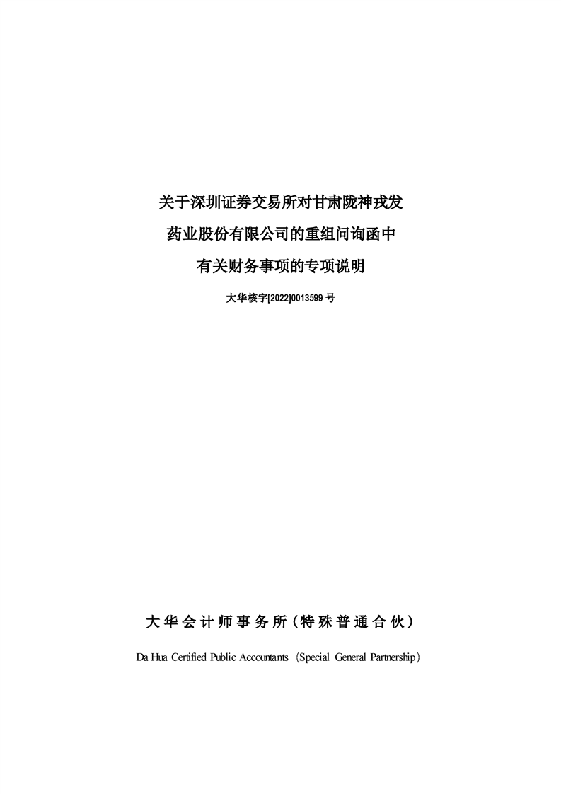 关于深圳证券交易所对甘肃非凡娱乐药业股份有限公司的重组问询函中有关财务事项的专项说明大华核字[2022]0013599号