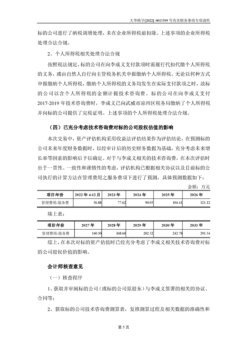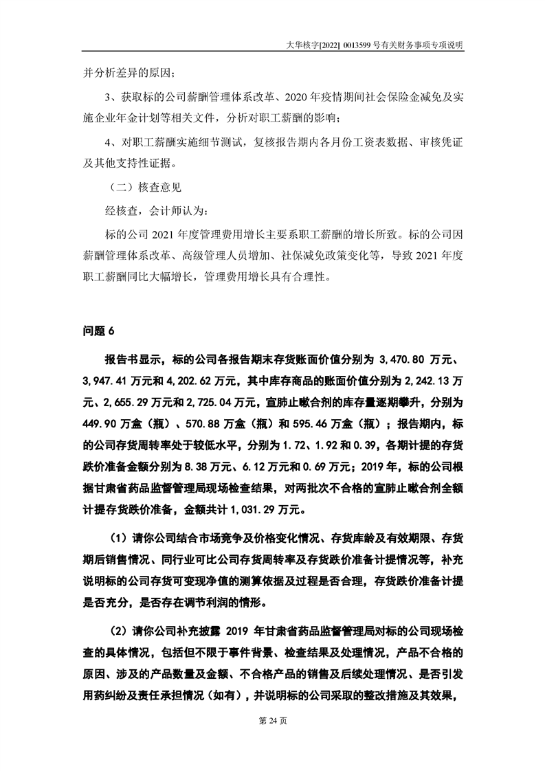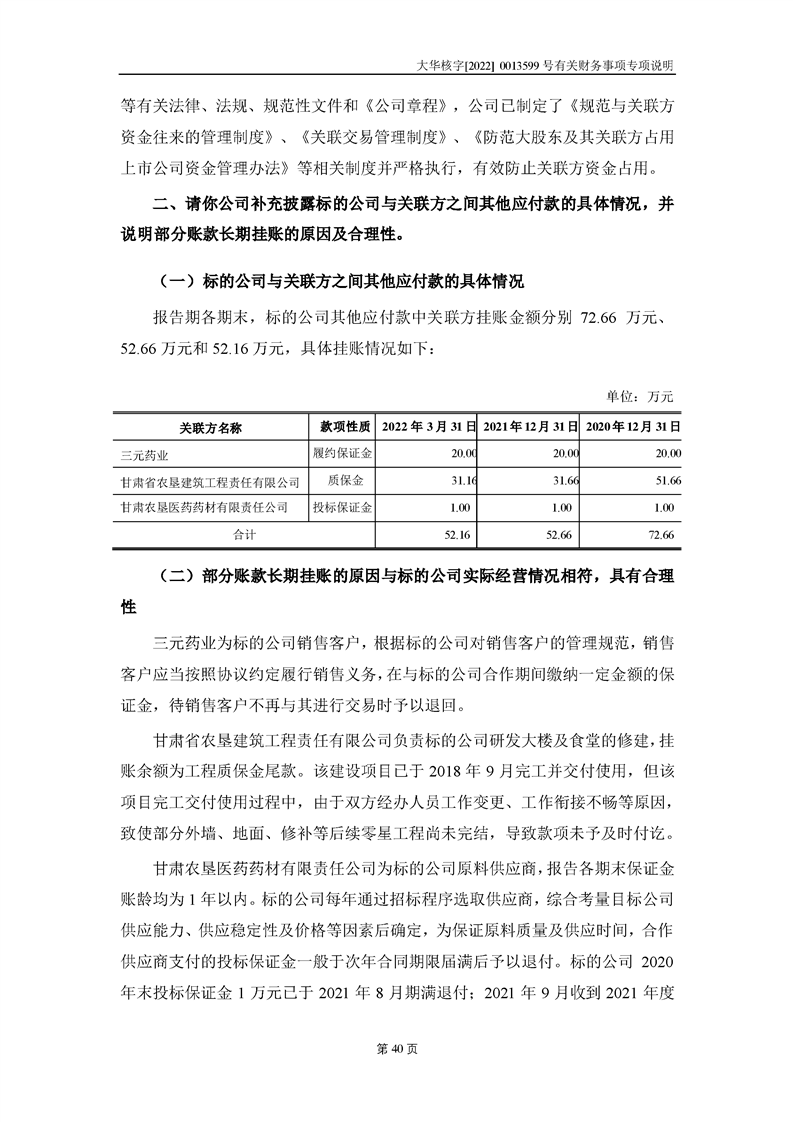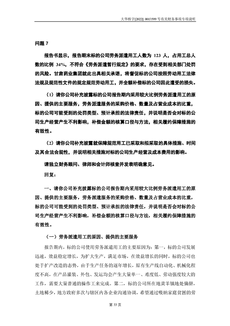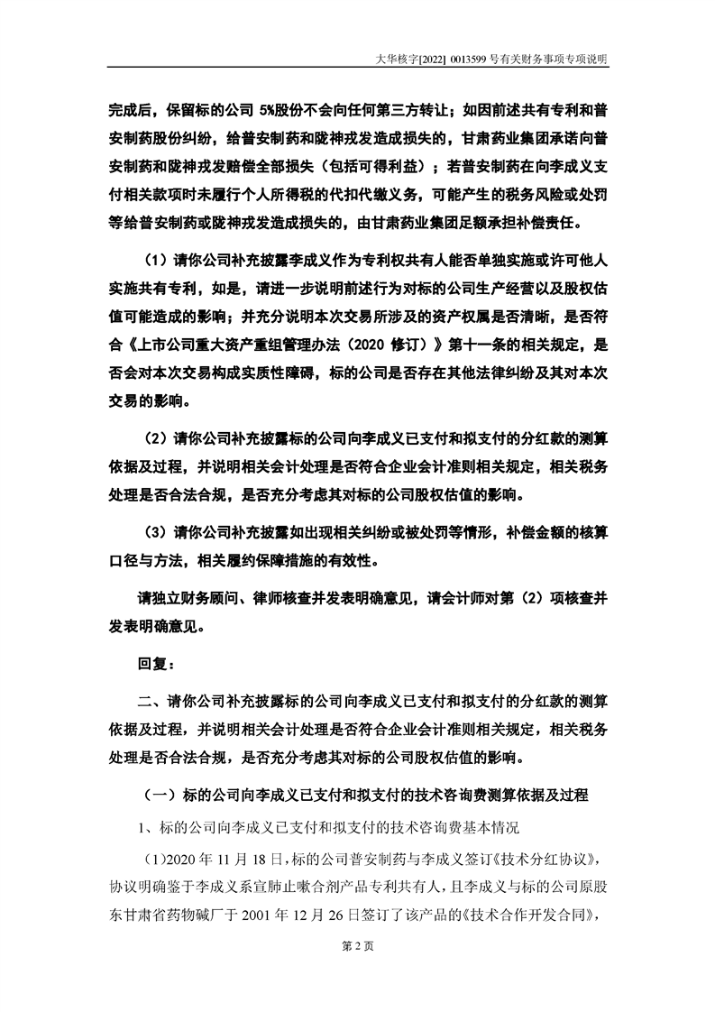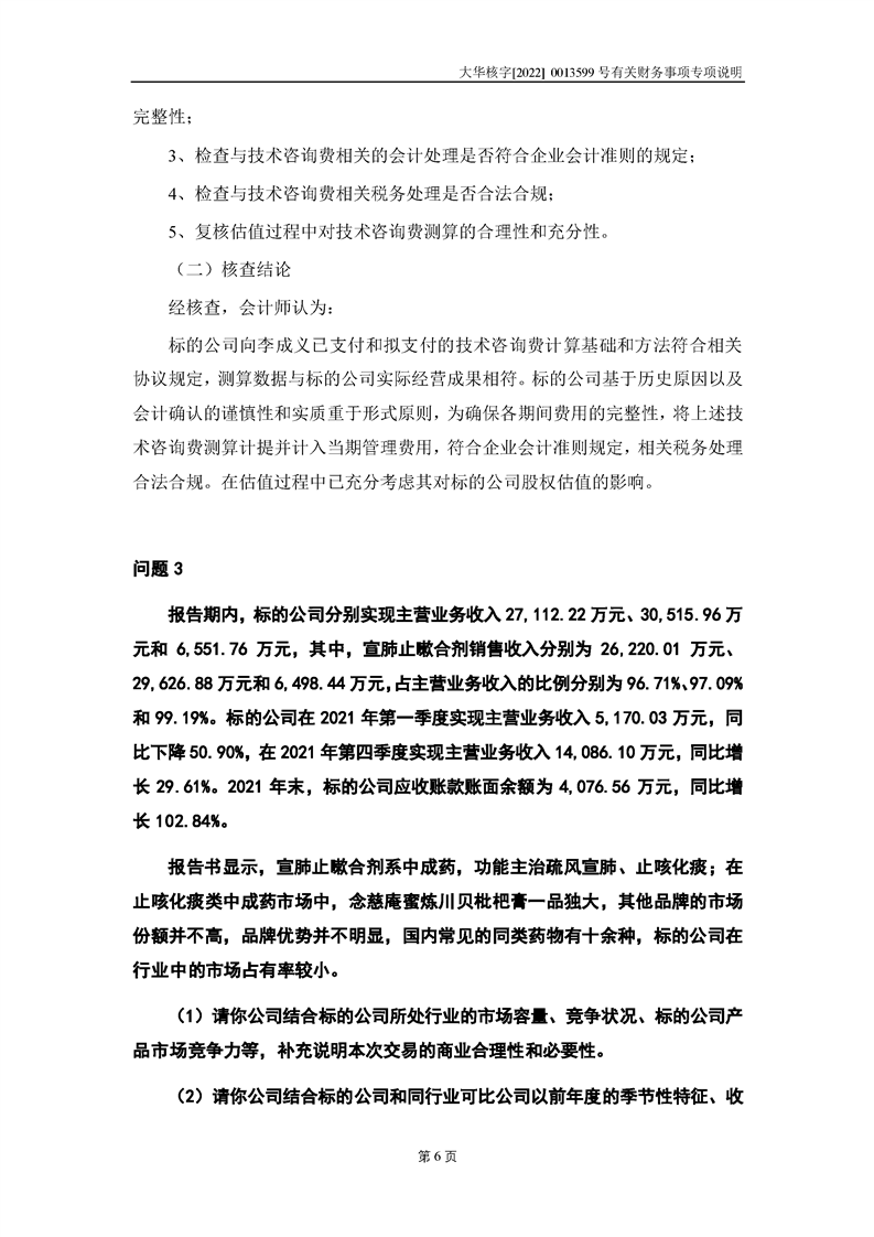 关于深圳证券交易所对甘肃非凡娱乐药业股份有限公司的重组问询函中有关财务事项的专项说明大华核字[2022]0013599号