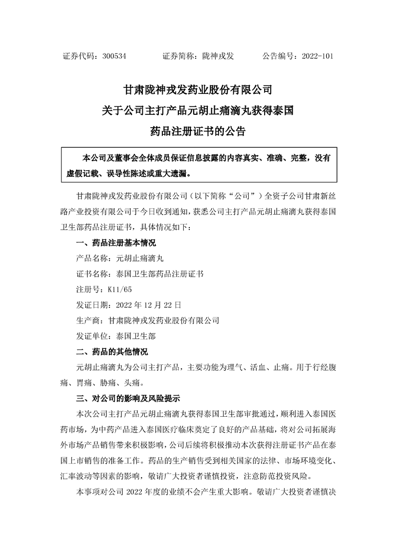 关于公司主打产品元胡止痛滴丸获得泰国药品注册证书的公告