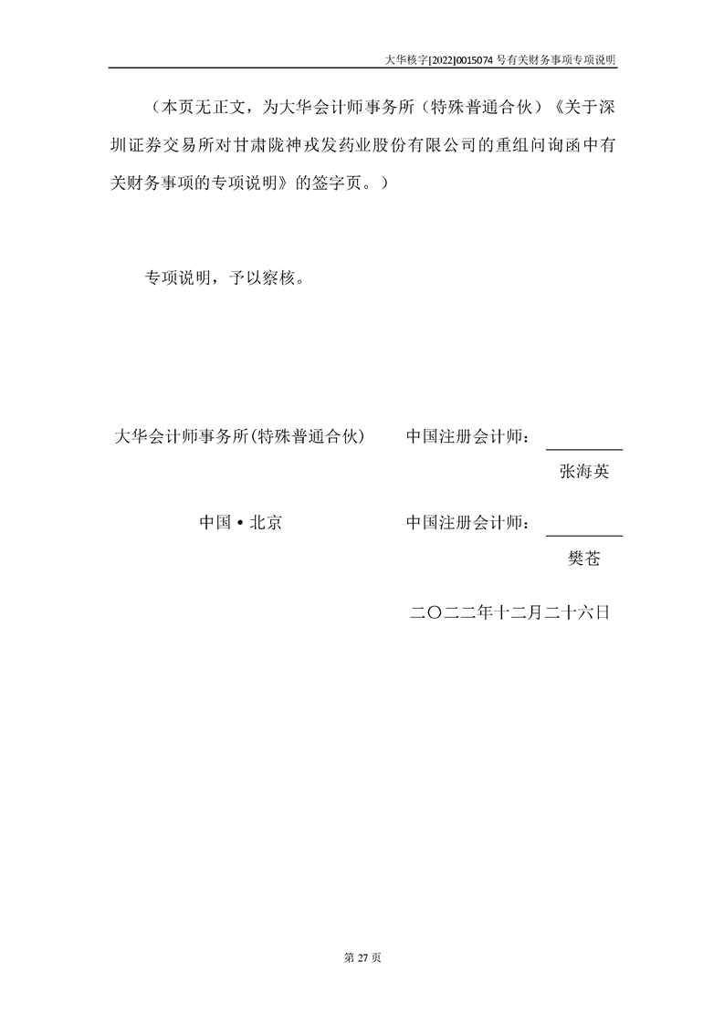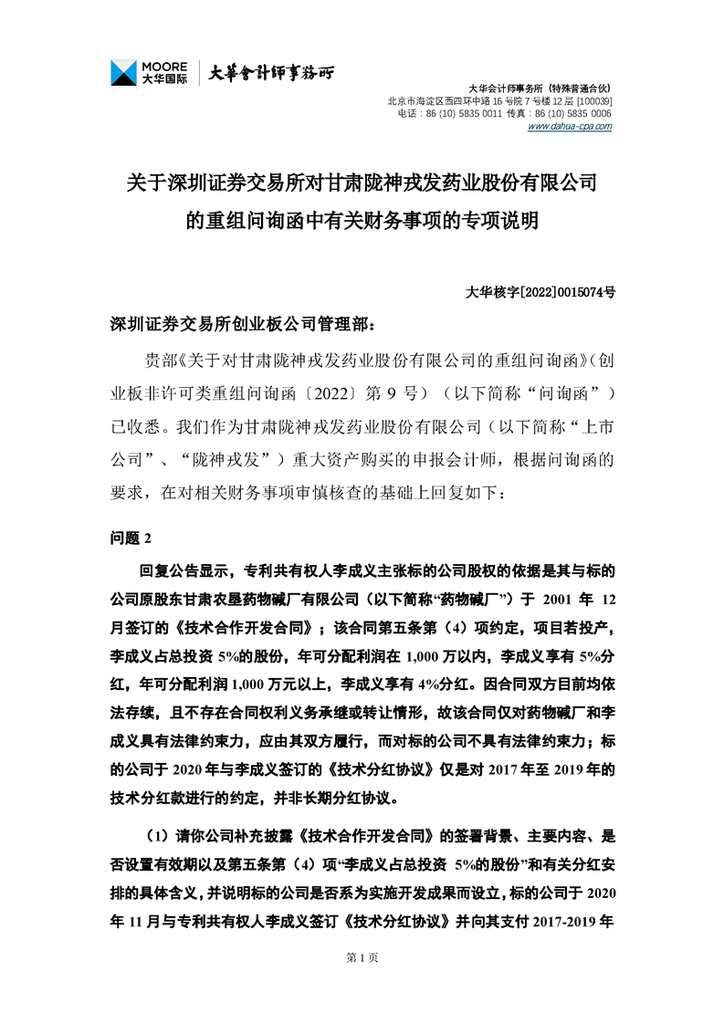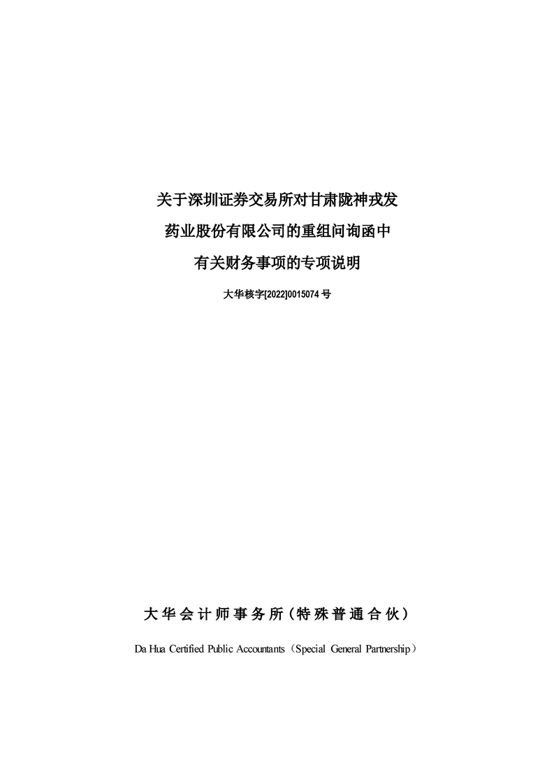 关于深圳证券交易所对甘肃非凡娱乐药业股份有限公司的重组问询函中有关财务事项的专项说明-大华核字[2022]0015074号