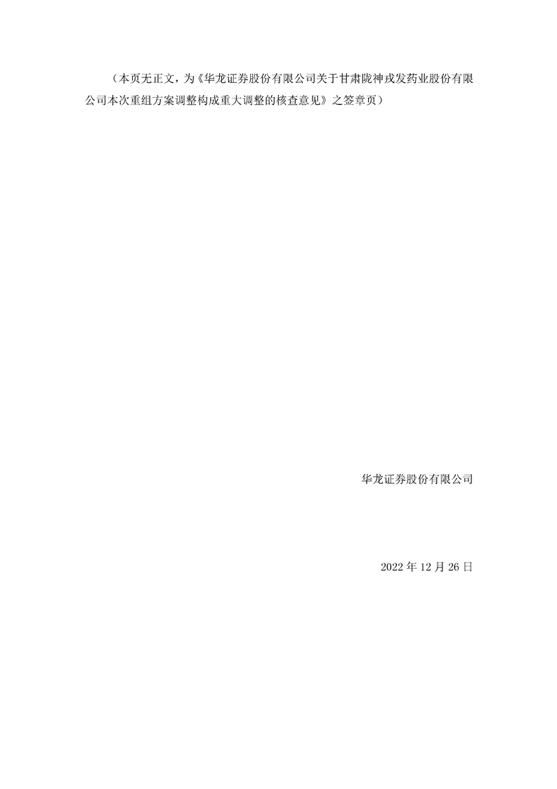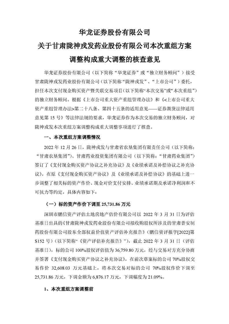 华龙证券股份有限公司关于甘肃非凡娱乐药业股份有限公司本次重组方案调整构成重大调整的核查意见