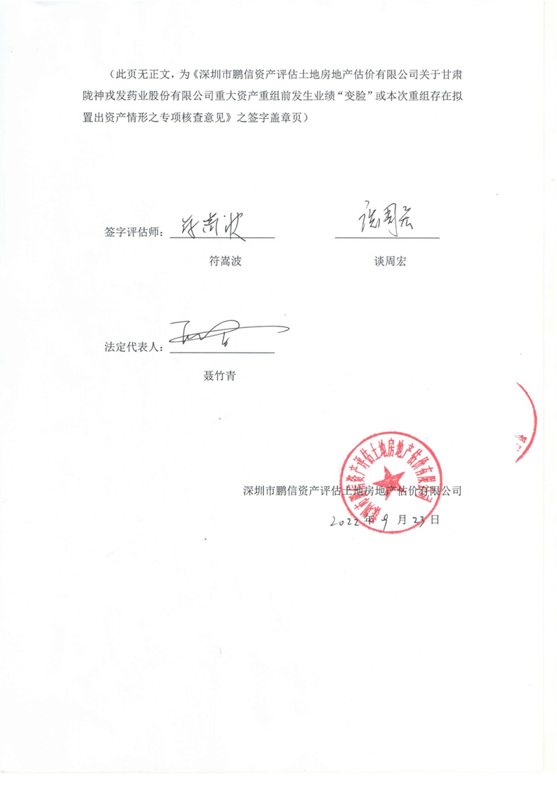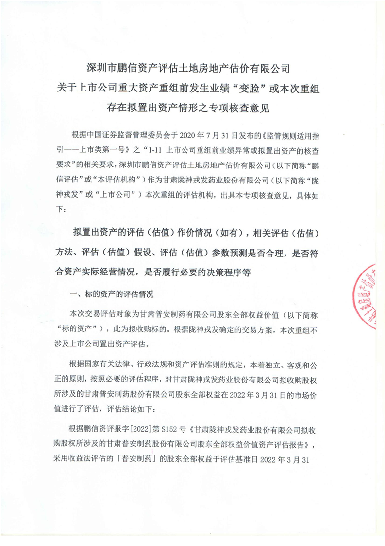 深圳鹏信资产评估公司关于上市公司重大资产重组前发生业绩变脸或本次重组存在拟置出资产情形之专项核查意见