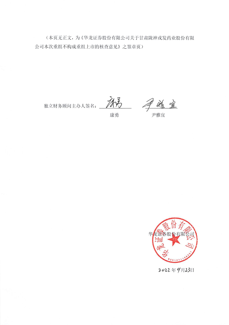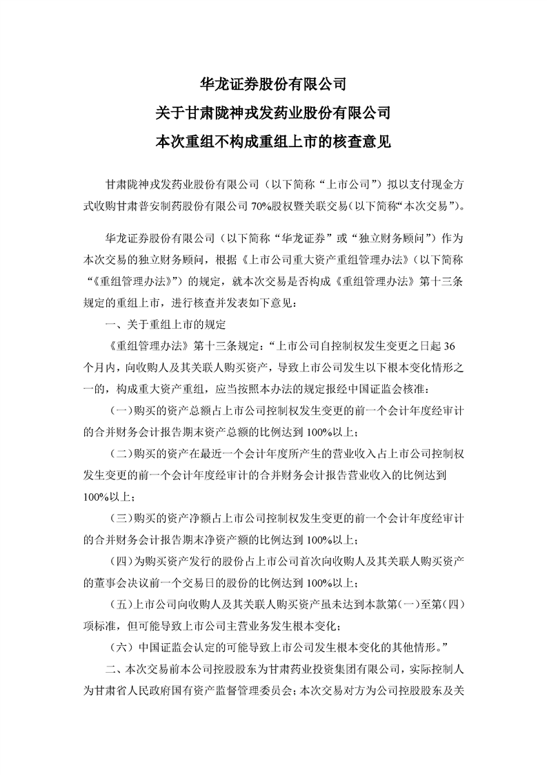 华龙证券股份有限公司关于甘肃非凡娱乐药业股份有限公司本次重组不构成重组上市的核查意见