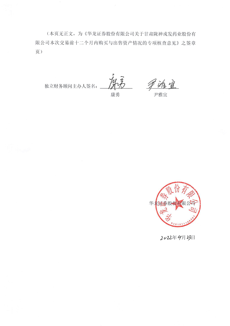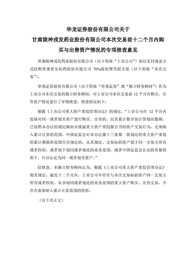 华龙证券股份有限公司关于甘肃非凡娱乐药业股份有限公司本次交易前十二个月内购买与出售资产情况的专项核查意见