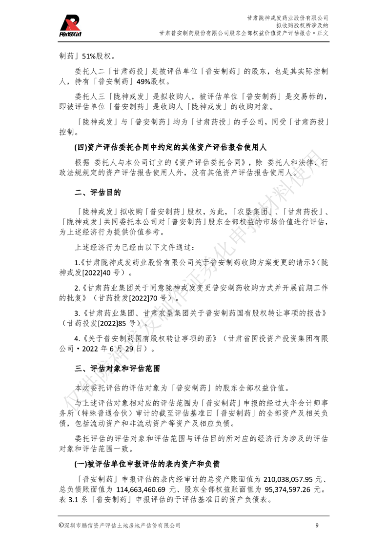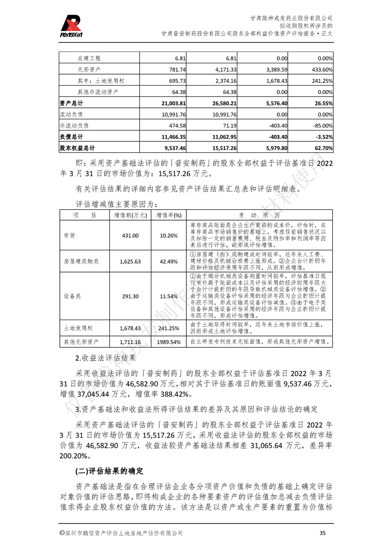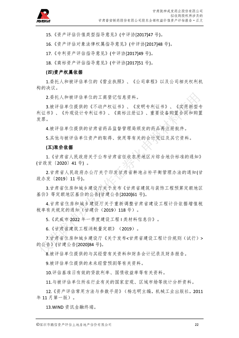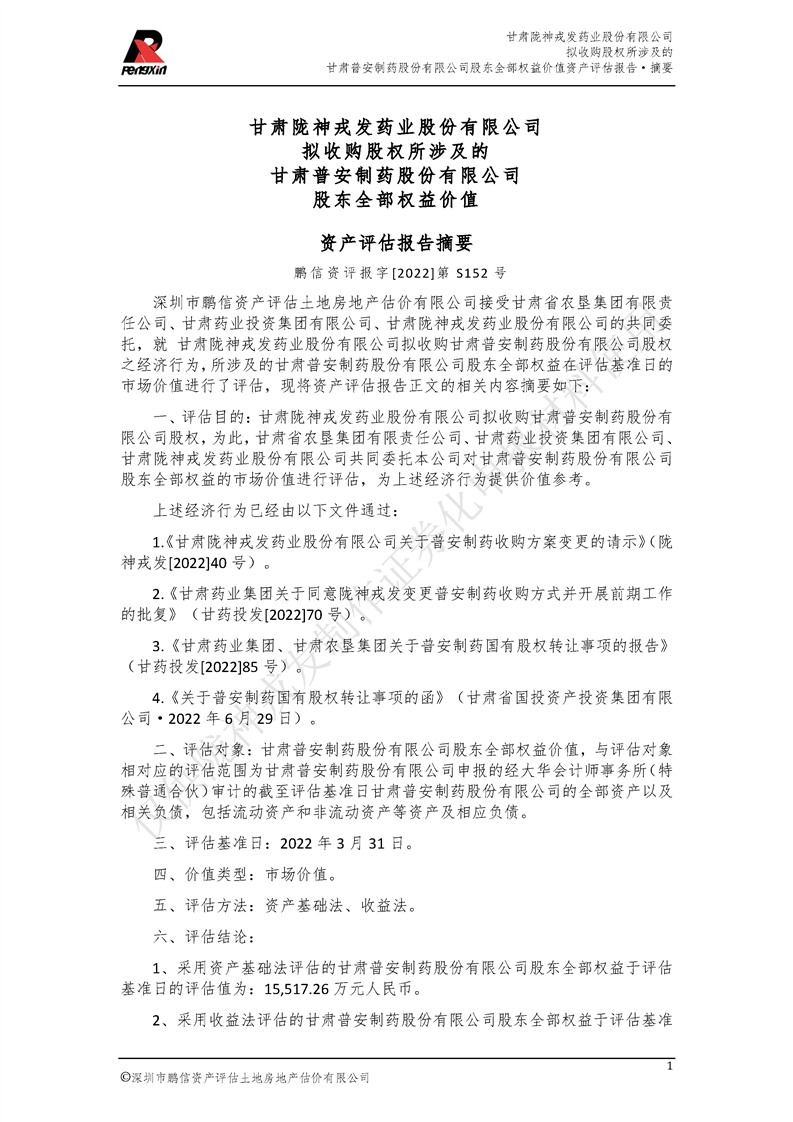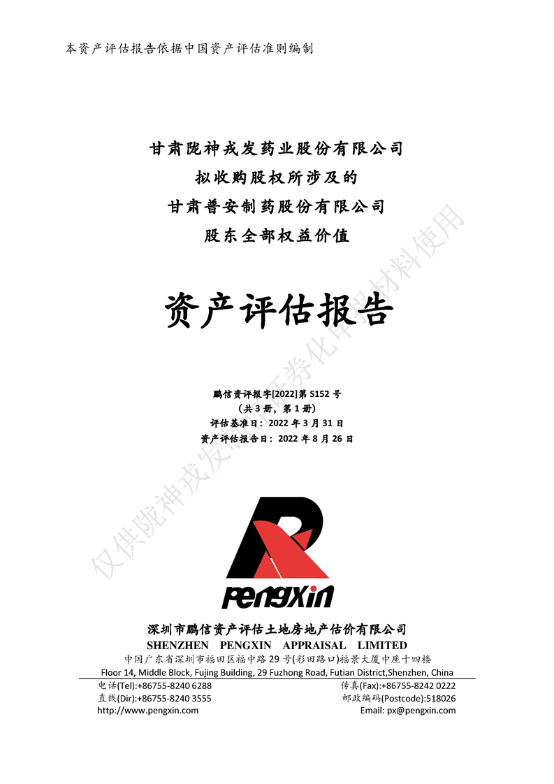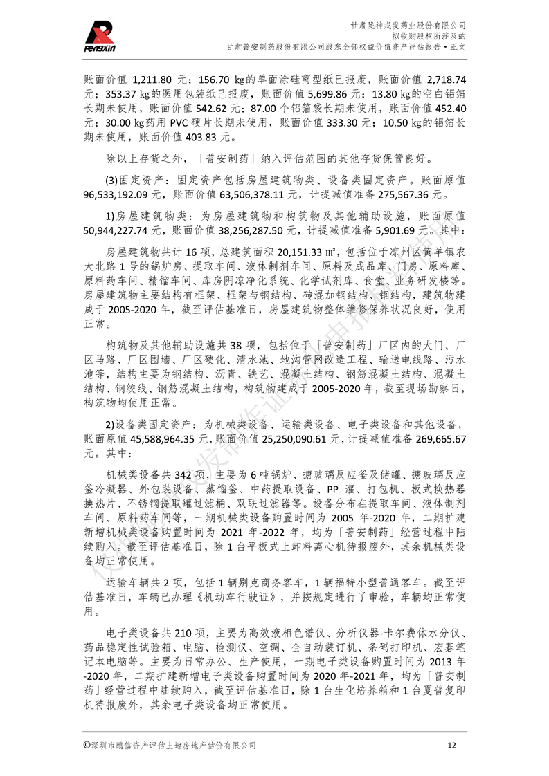 甘肃普安制药股份有限公司全部权益价值资产评估报告-鹏信资评报字[2022]第S152号