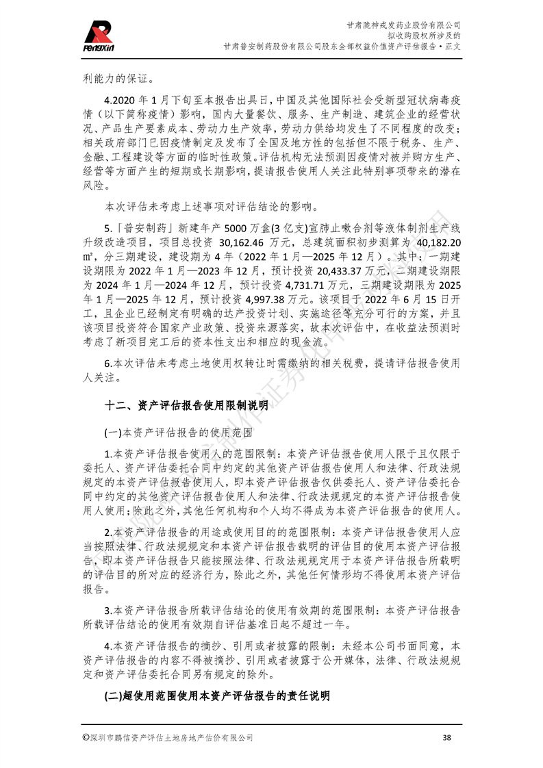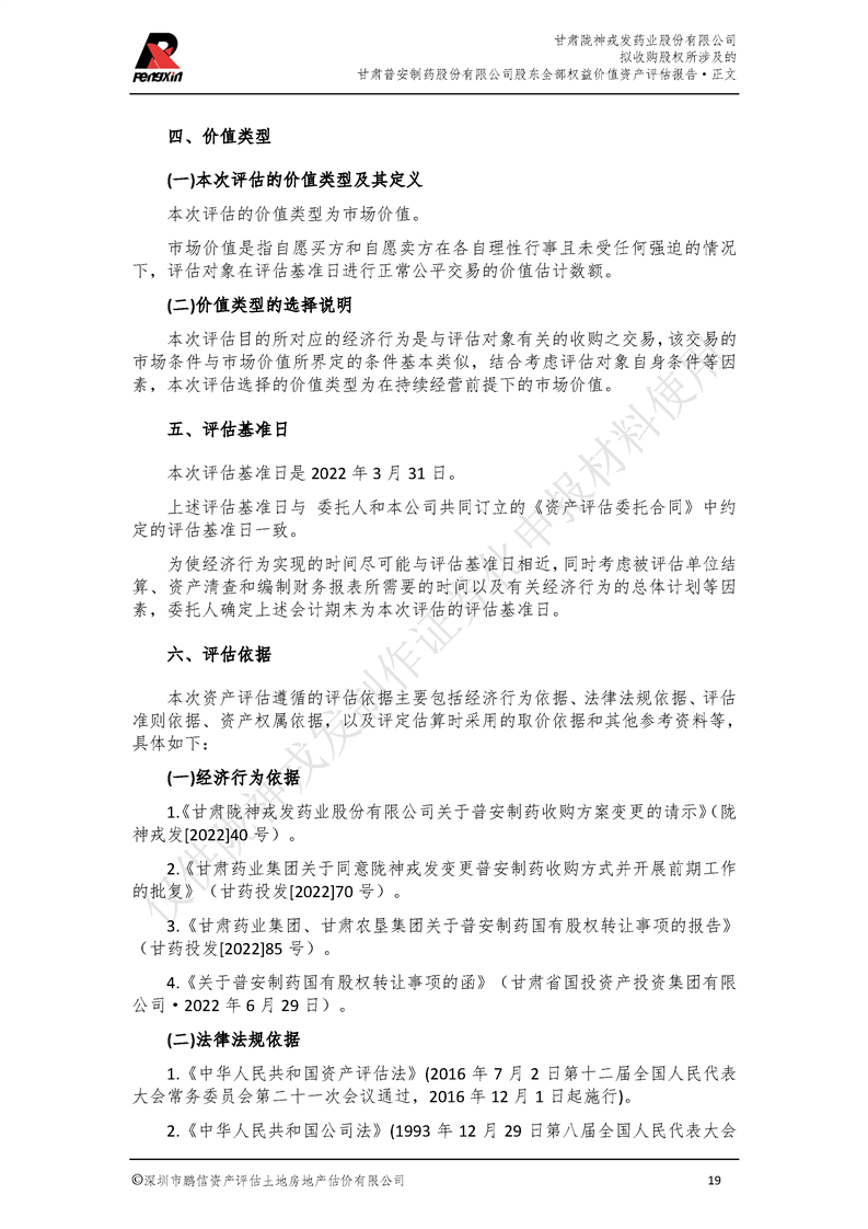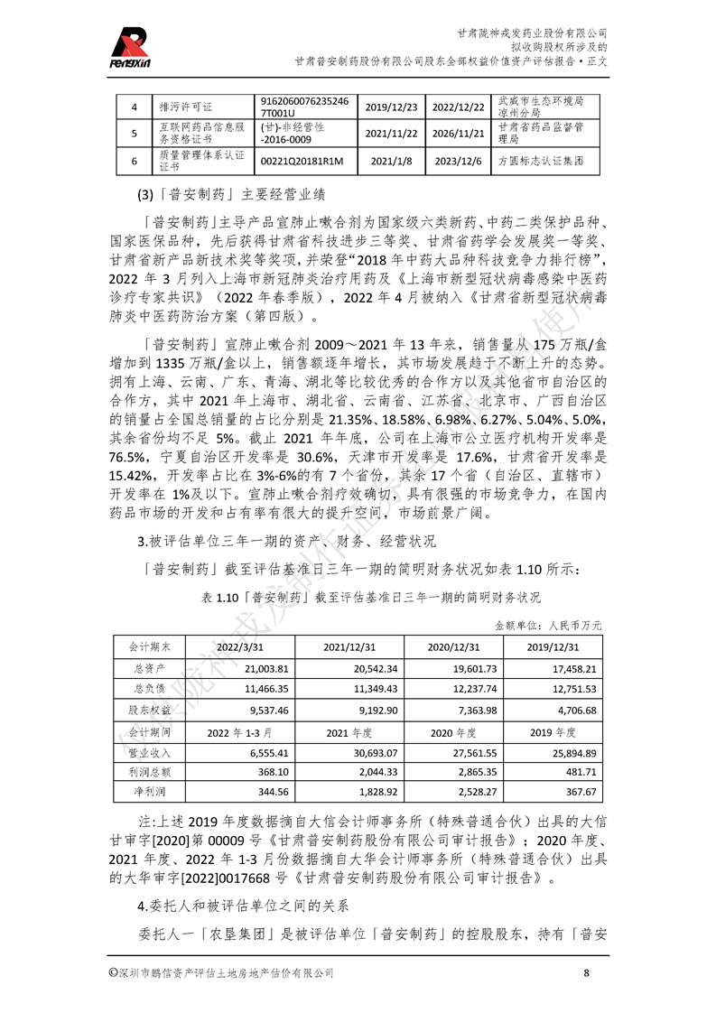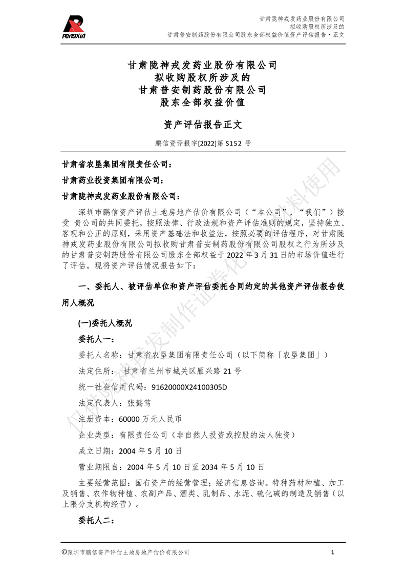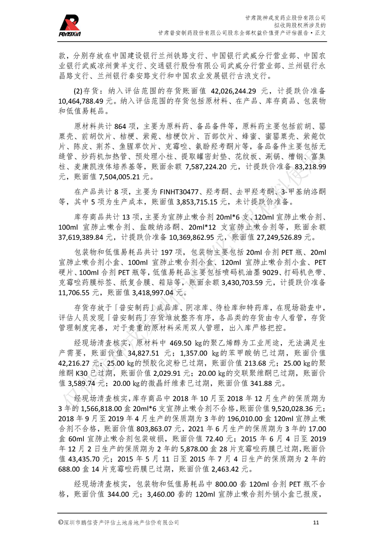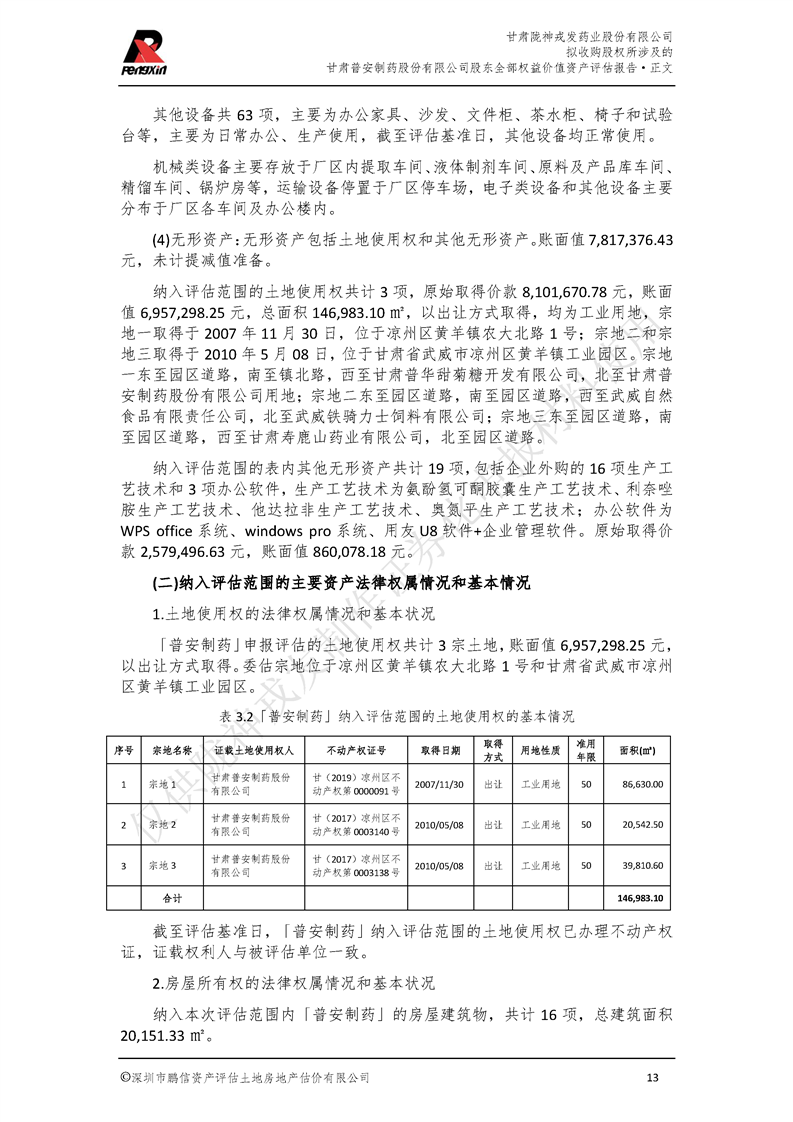 甘肃普安制药股份有限公司全部权益价值资产评估报告-鹏信资评报字[2022]第S152号