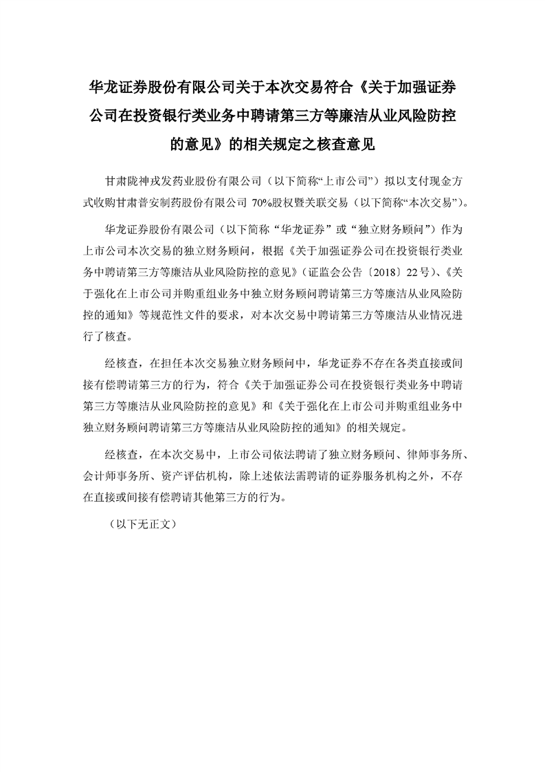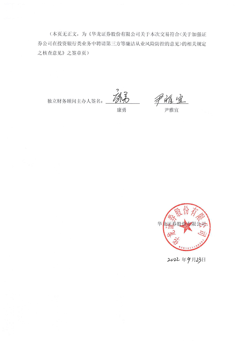 华龙证券股份有限公司关于本次交易符合《关于加强证券公司在投资银行类业务中聘请第三方等廉洁从业风险防控的意见》的相关规定之核查意见