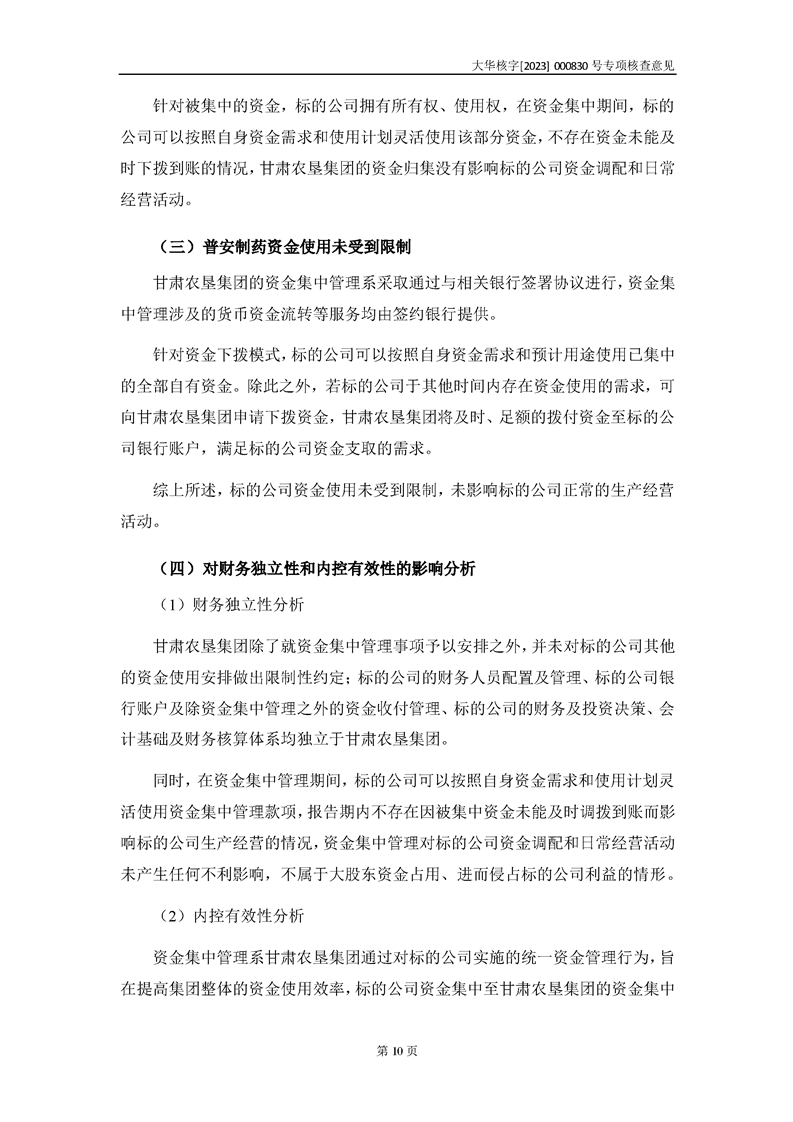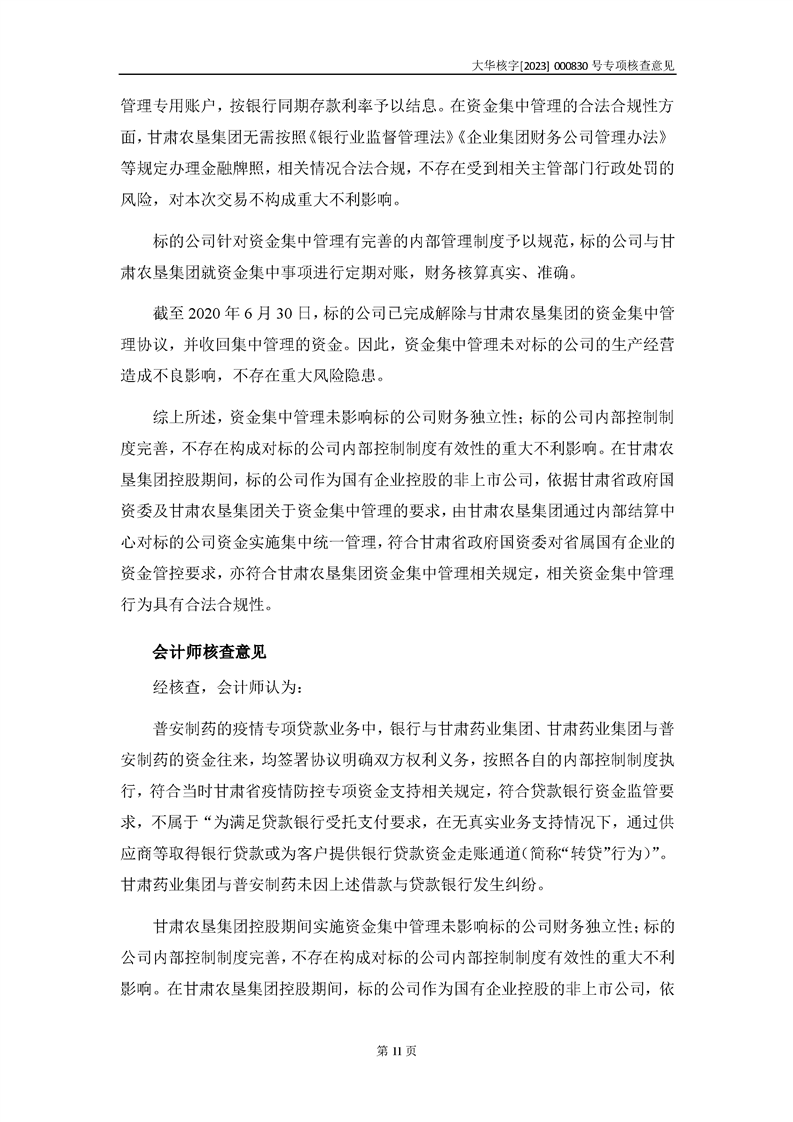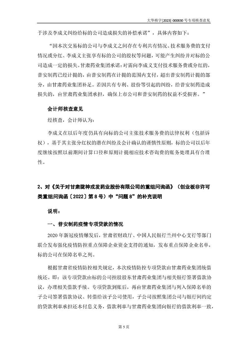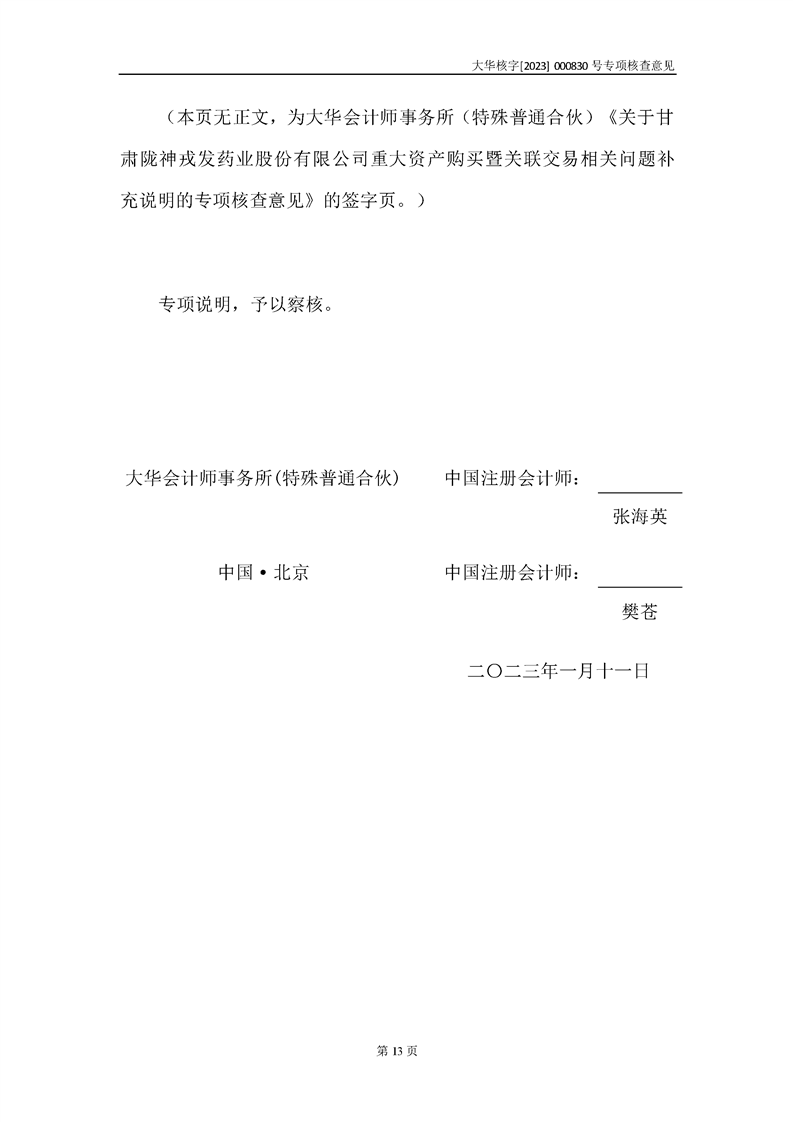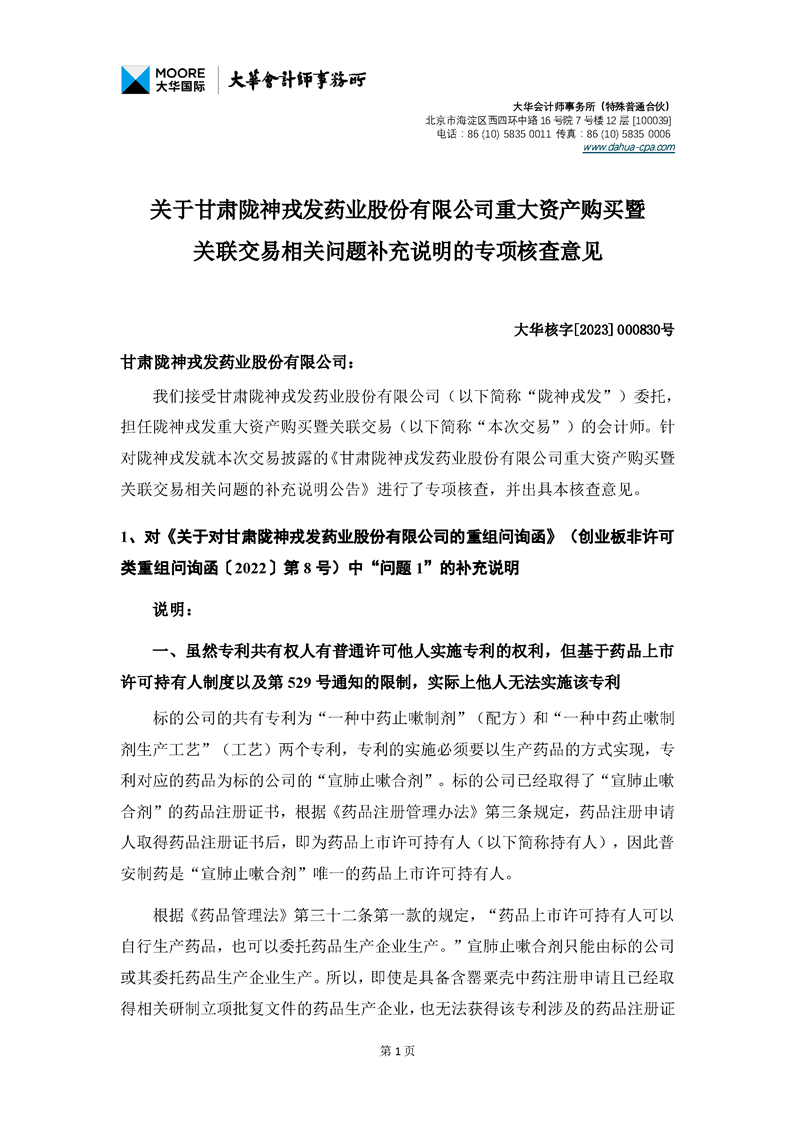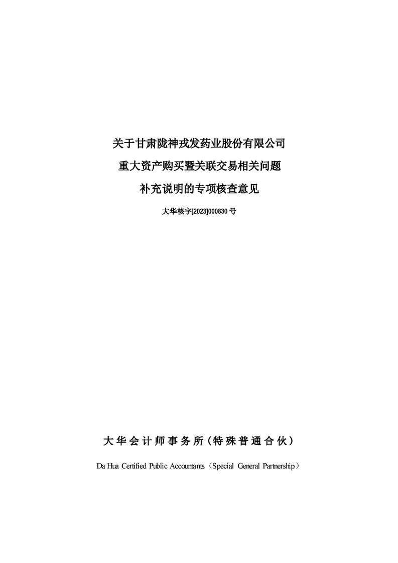 大华会计师事务所关于甘肃非凡娱乐药业股份有限公司重大资产购买暨关联交易相关问题补充说明的专项核查意见--大华核字[2023]000830号