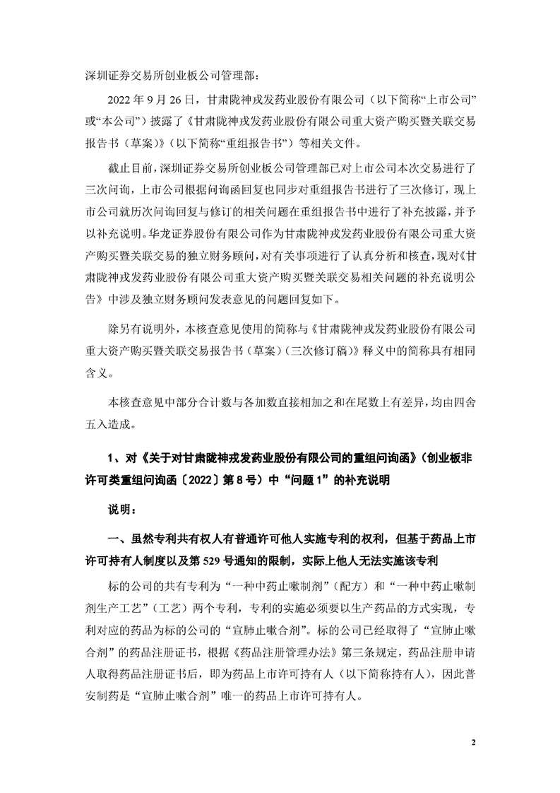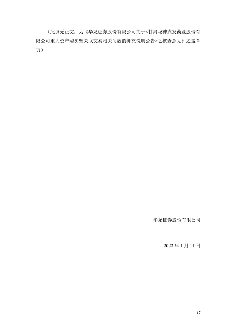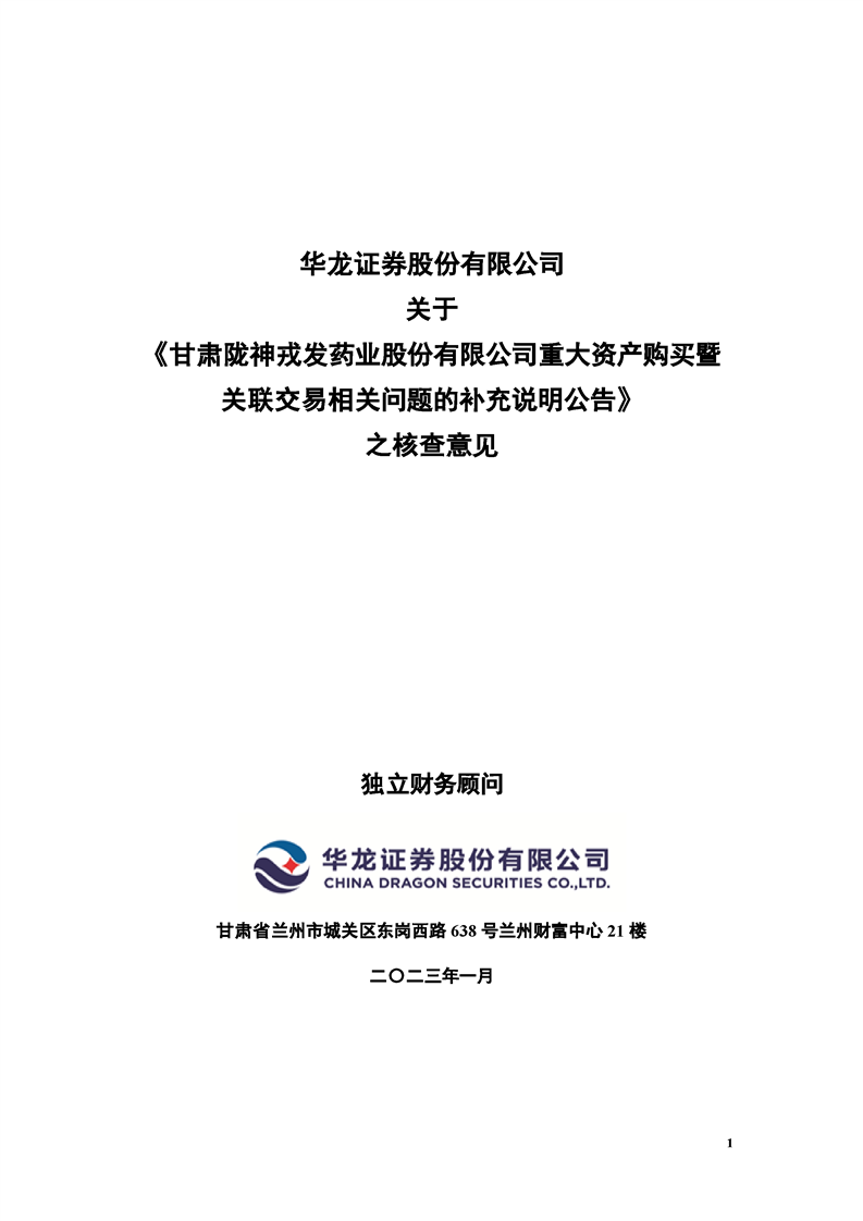 华龙证券股份有限公司关于《甘肃非凡娱乐药业股份有限公司重大资产购买暨关联交易相关问题的补充说明公告》之核查意见