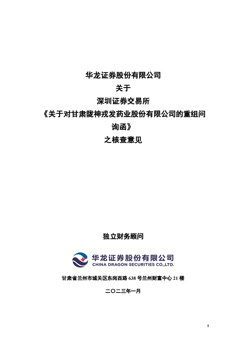 华龙证券股份有限公司关于深圳证券交易所《关于对甘肃非凡娱乐药业股份有限公司的重组问询函》之核查意见
