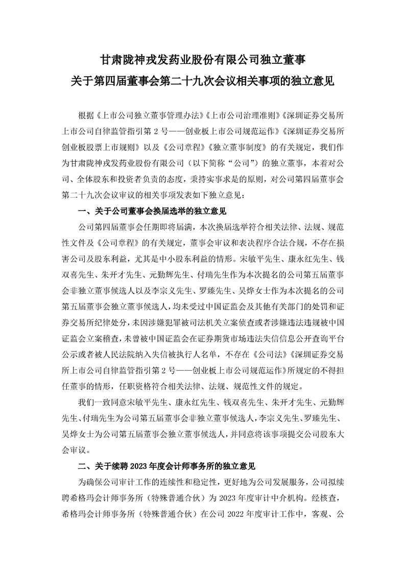 独立董事关于第四届董事会第二十九次会议相关事项的独立意见