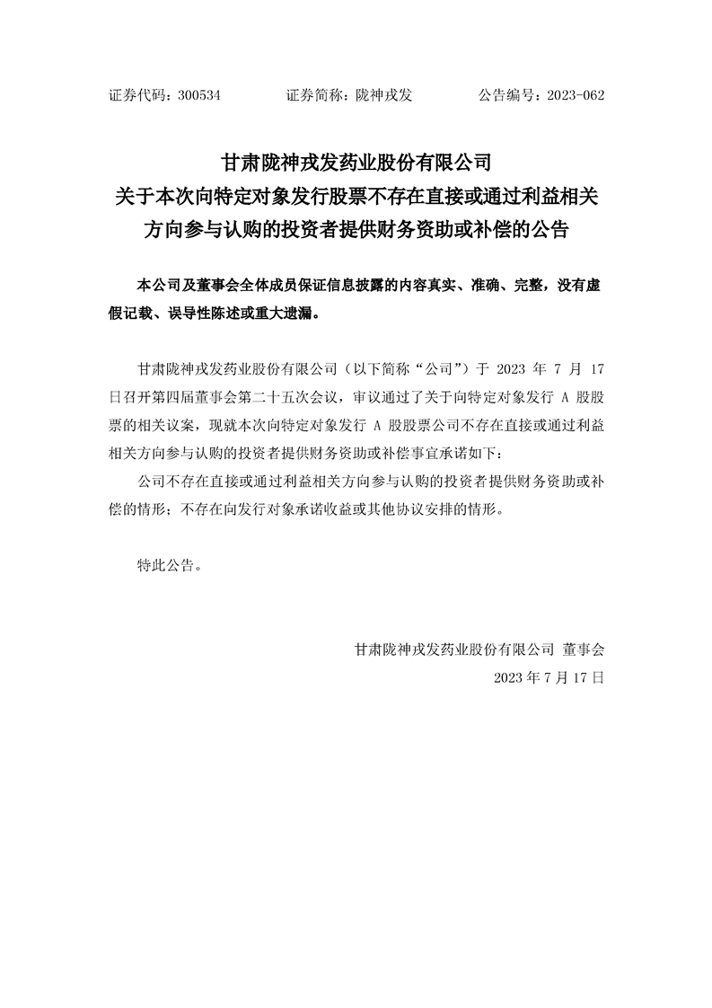 关于本次向特定对象发行股票不存在直接或通过利益相关方向参与认购的投资者提供财务资助或补偿的公告