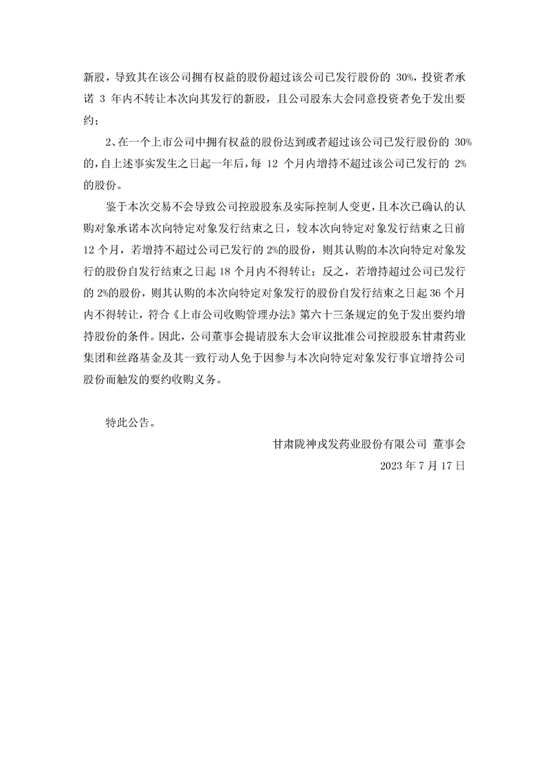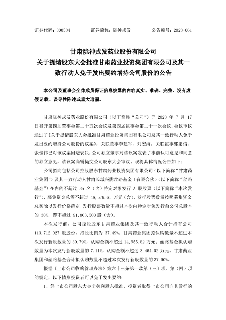 关于提请股东大会批准甘肃药业投资集团有限公司及其一致行动人免于发出要约增持公司股份的公告