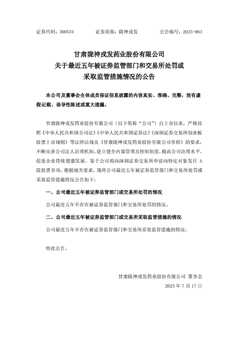 关于最近五年被证券监管部门和交易所处罚或采取监管措施情况的公告