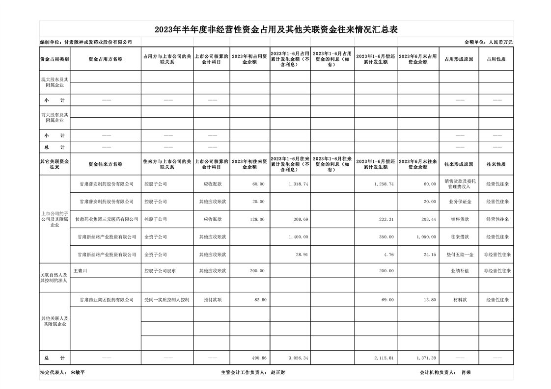 2023年半年度非经营性资金占用及其他关联资金往来情况汇总表