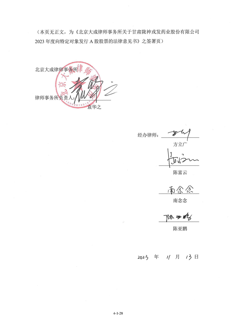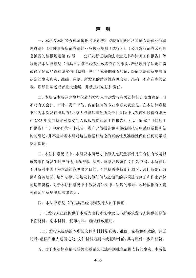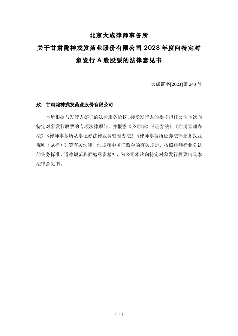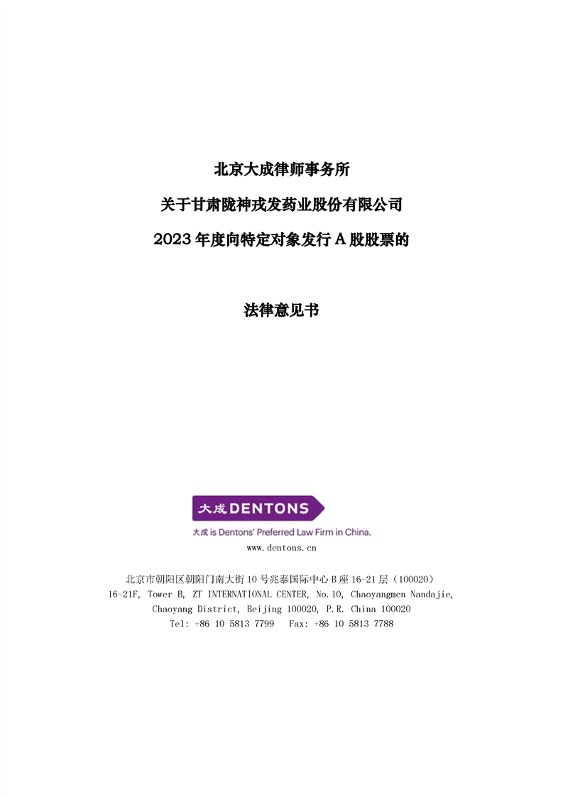 北京大成律师事务所关于甘肃非凡娱乐药业股份有限公司2023年度向特定对象发行A股股票的法律意见书
