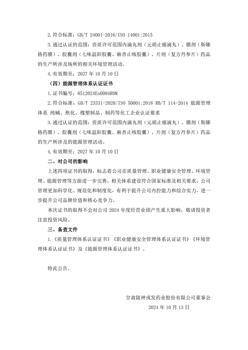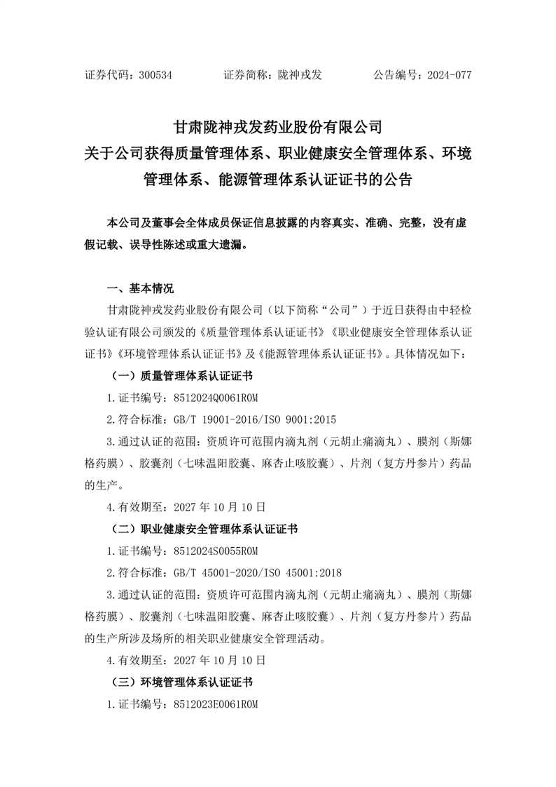 关于公司获得质量管理体系、职业健康安全管理体系、环境管理体系、能源管理体系认证证书的公告