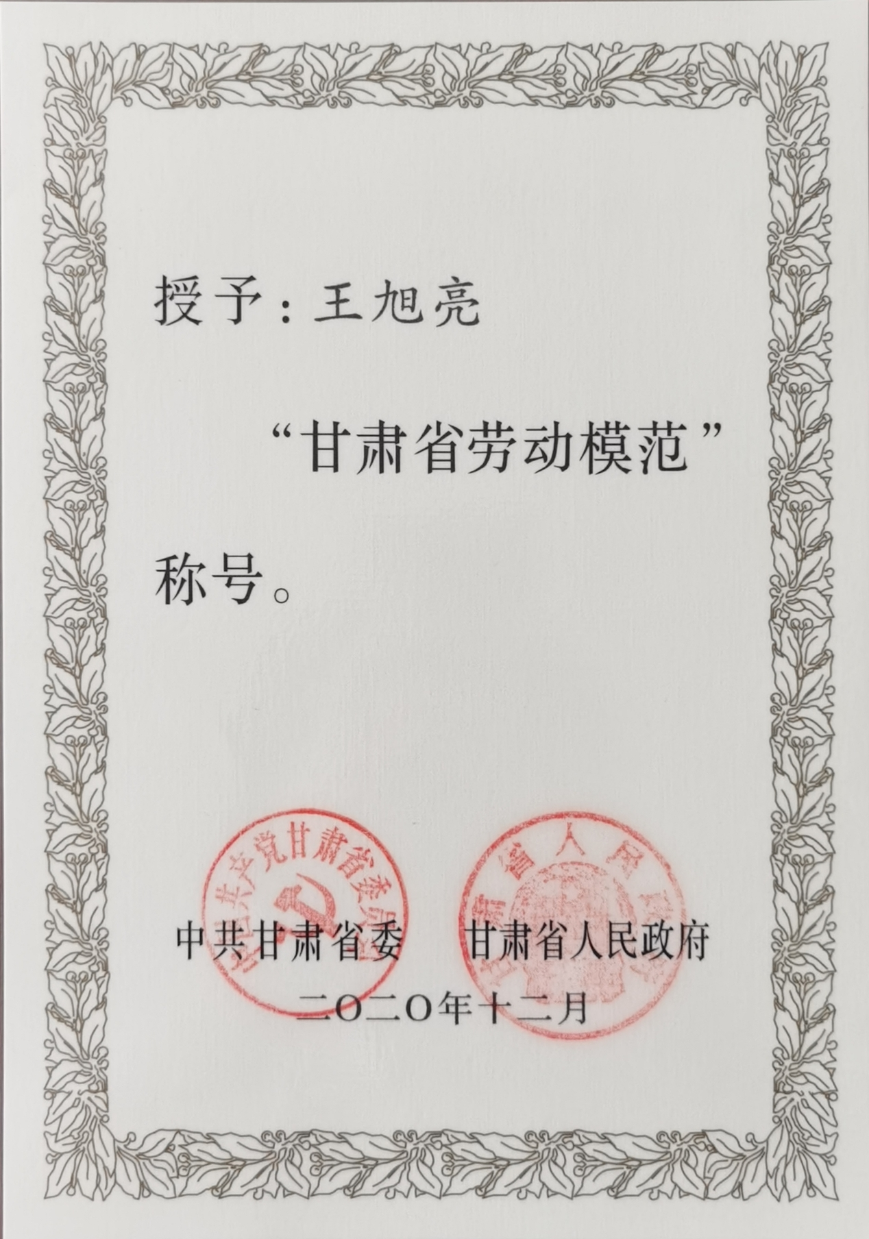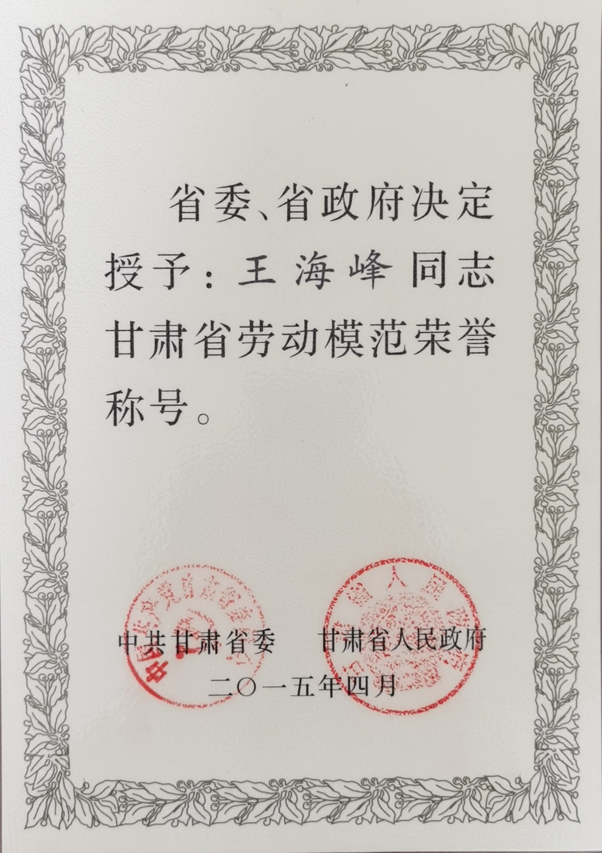 非凡娱乐任一杰、王海峰、王旭亮分别获“全国五一劳动奖章”、“甘肃省劳动模范”荣誉称号